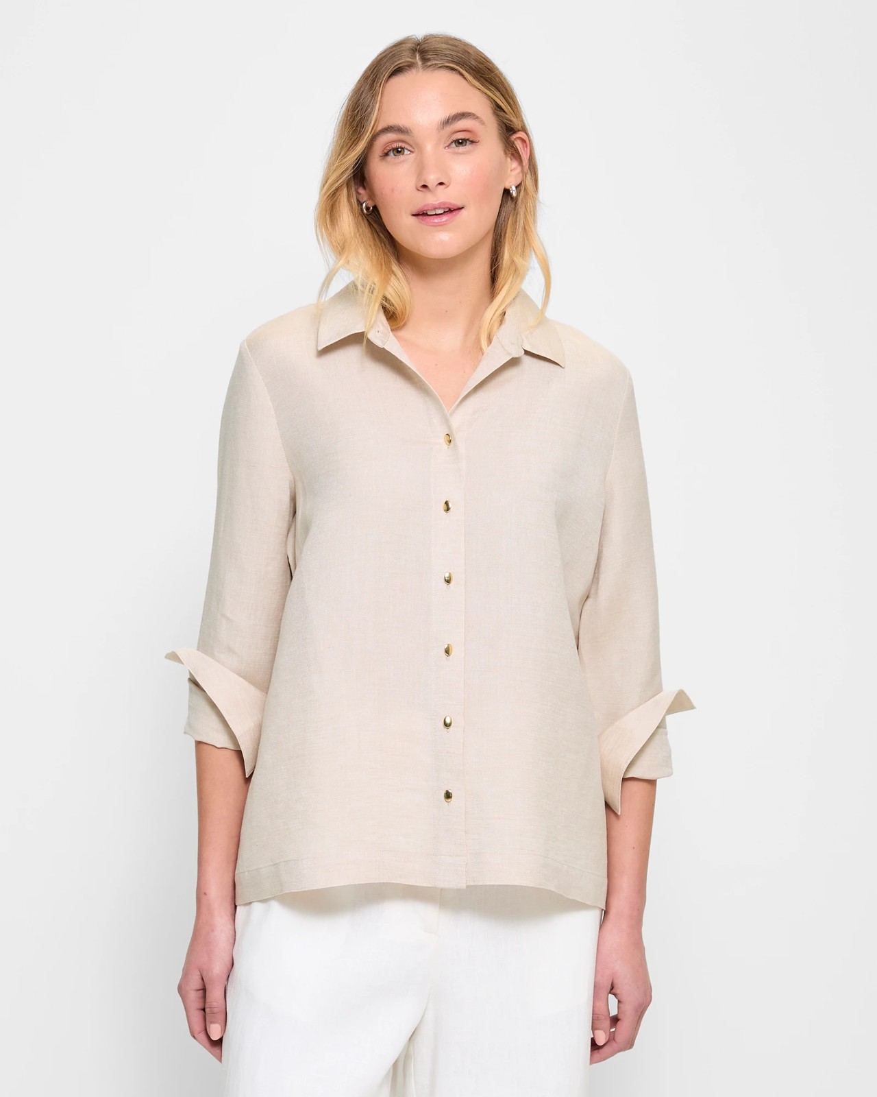 Step up your wardrobe with our Preview Linen Blend Long Sleeve Shirt. Made with a light linen/viscose blend, it guarantees all-day comfort and ease. Featuring a round collar and stylish oval buttons, this shirt provides a regular fit that looks great on everyone. The long button cuff sleeves offer a polished look, while the regular length with a straight hemline gives it a contemporary twist. Ideal for both formal and casual outings, pair it with your favourite jeans or a sleek skirt to achieve the perfect ensemble. Add this stylish piece to your collection today!