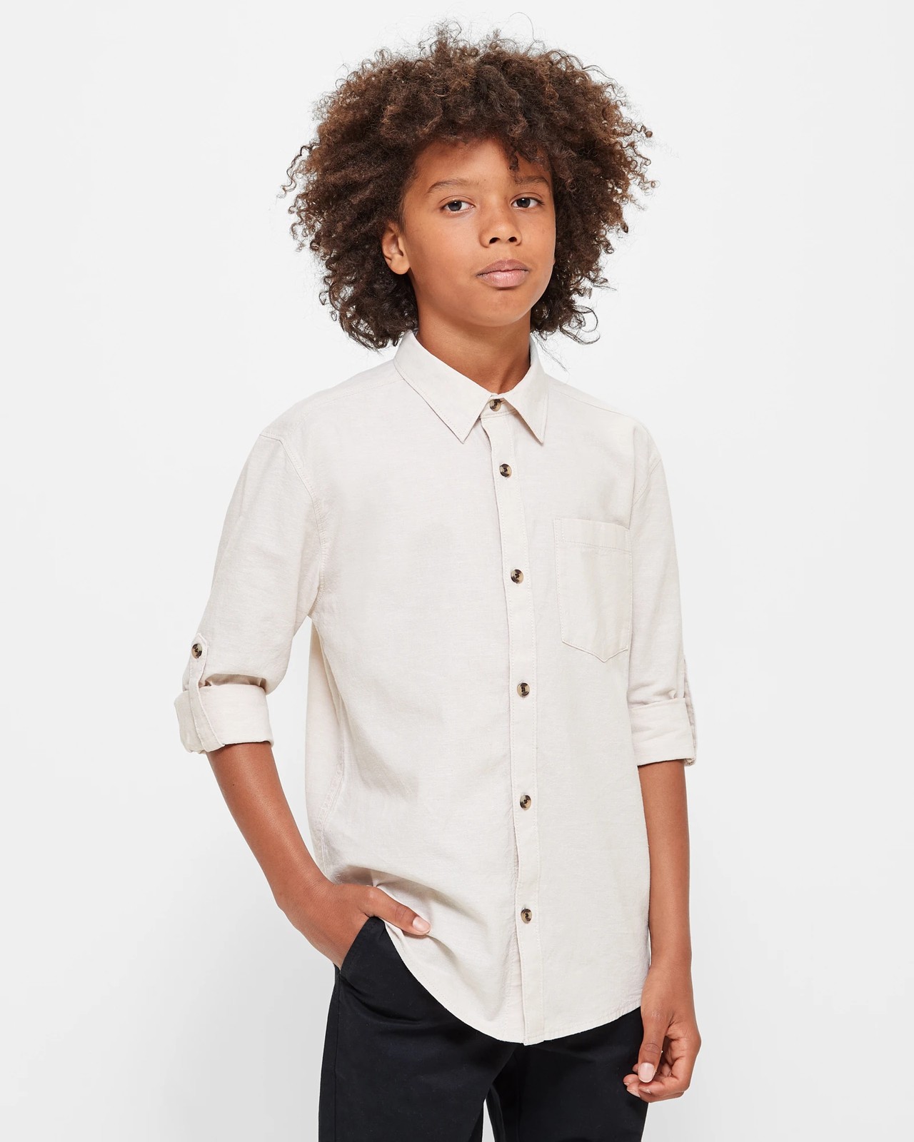 This Linen Blend Long Sleeve Shirt is perfect for boys looking for a stylish yet comfortable option. Made with a lightweight cotton linen blend, it offers a regular fit with a collared design, long sleeves with buttoned cuffs, and a convenient button-up front. The single chest pocket and curved hem add practicality and style. Elevate your little one's wardrobe with this versatile and easy-to-wear shirt.