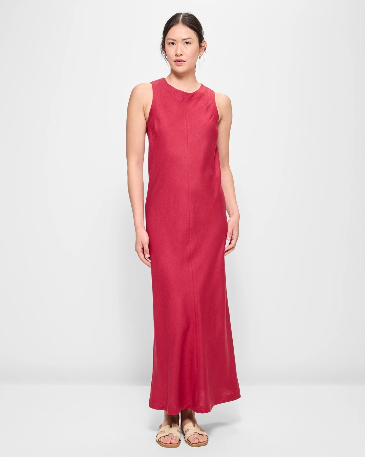 Discover the charm of our Linen Blend Maxi Shift Dress. Made from a breathable mix of linen and viscose, this garment ensures a light and airy feel throughout your day. Designed with a regular fit, it features a round neckline and sleeveless arms, making it perfect for warm weather. The dress includes darting at the chest and a straight hemline, providing a classic look. With an invisible back zip and a centre split at the bottom, you’ll find both style and ease in movement. Add this timeless piece to your collection today!