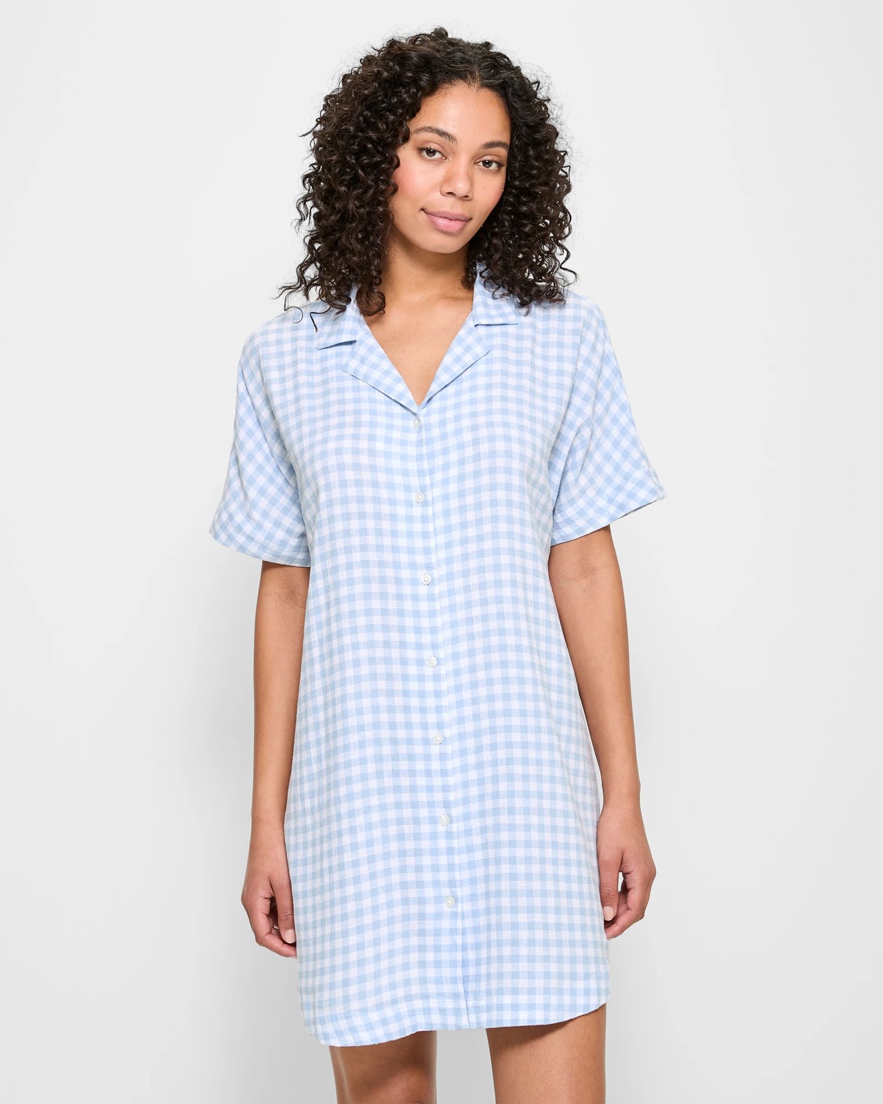 Drift off into blissful sleep wrapped in the breathable luxury our linen blend sleep nightie offers. Its lightweight fabric and charming gingham design feel wonderfully soft against your skin, keeping you cool and comfortable all night long. The classic round collared neckline with charming front lapels brings a touch gentle sophistication. The button-through front and short cuffed sleeves add practical convenience, while the curved hemline creates a beautifully modest midi-length. Experience ultimate night-time comfort and style—treat yourself today!