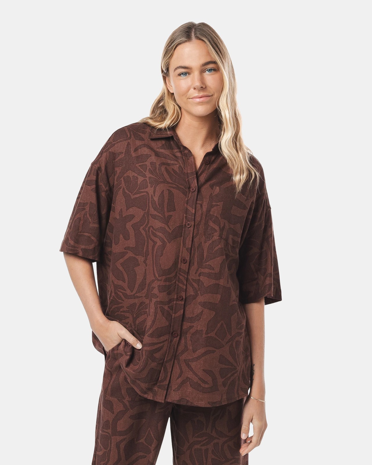 We love a set, although this stylish shirt will pair easily with your favourite bottoms. This linen blend shirt features a modern block print and an oversized fit. Featuring a collared neck and button up front, the Piping Hot shirt is suitable for day or night styling. Wear as an overshirt for additional styling options or pair with the matching pants (sold separately) for an easy set.