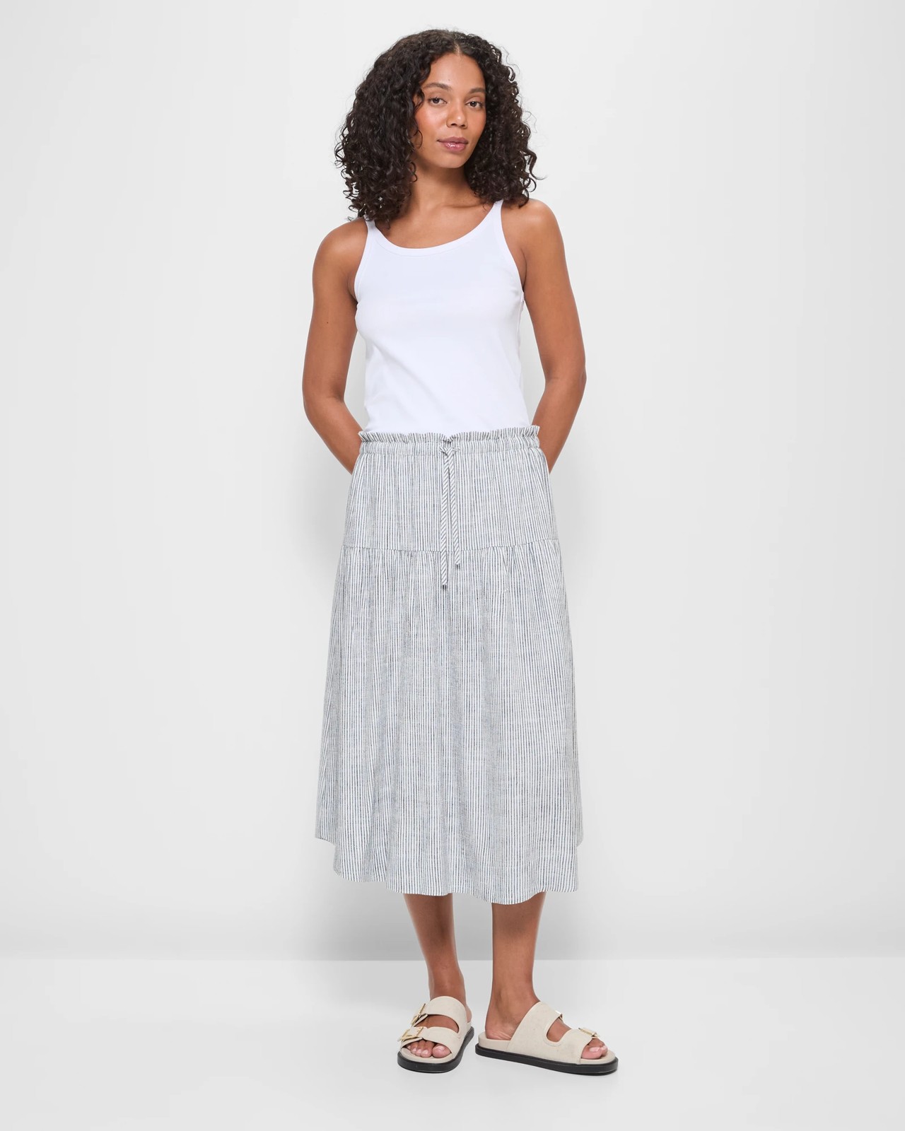 Step into style with our Linen Blend Paperbag Midi Skirt. This beautiful skirt, created from a soft viscose and linen blend, offers breathability and comfort. The regular fit is complemented by a thick elastic paperbag waistband with a drawstring for a perfect fit. Showcasing black and white stripes, it features panels extending from the waistband to the hem, ending in a graceful curved hemline. Ideal for both casual outings and more formal occasions, this skirt will quickly become a favourite in your wardrobe.