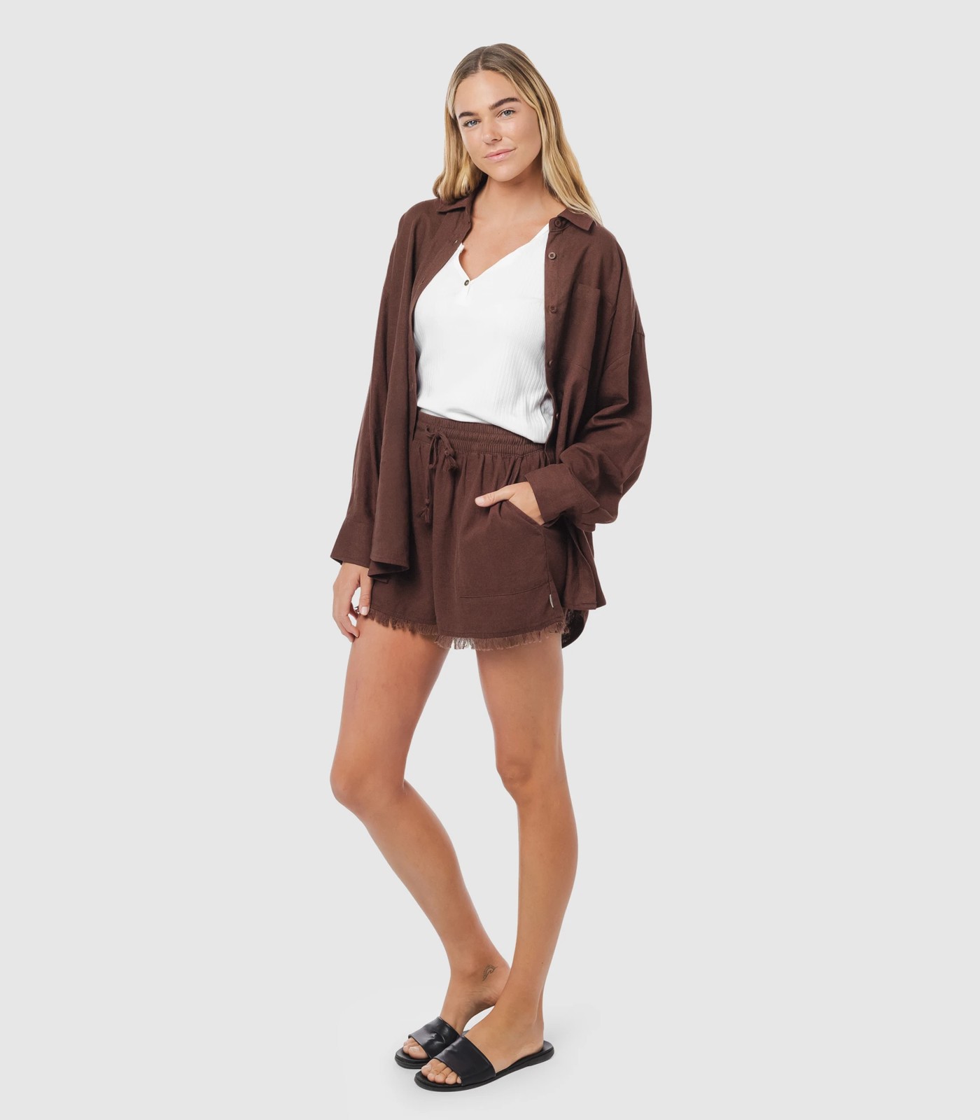 These Piping Hot shorts deliver relaxed and casual cool. For a lightweight short perfect for everyday wear these chocolate brown linen blend shorts combine comfort and style, with elasticated waist and pocket detailing. They are made from durable linen-viscose with frayed hem detail. Wear with the matching shirt for a stylish set (sold separately).