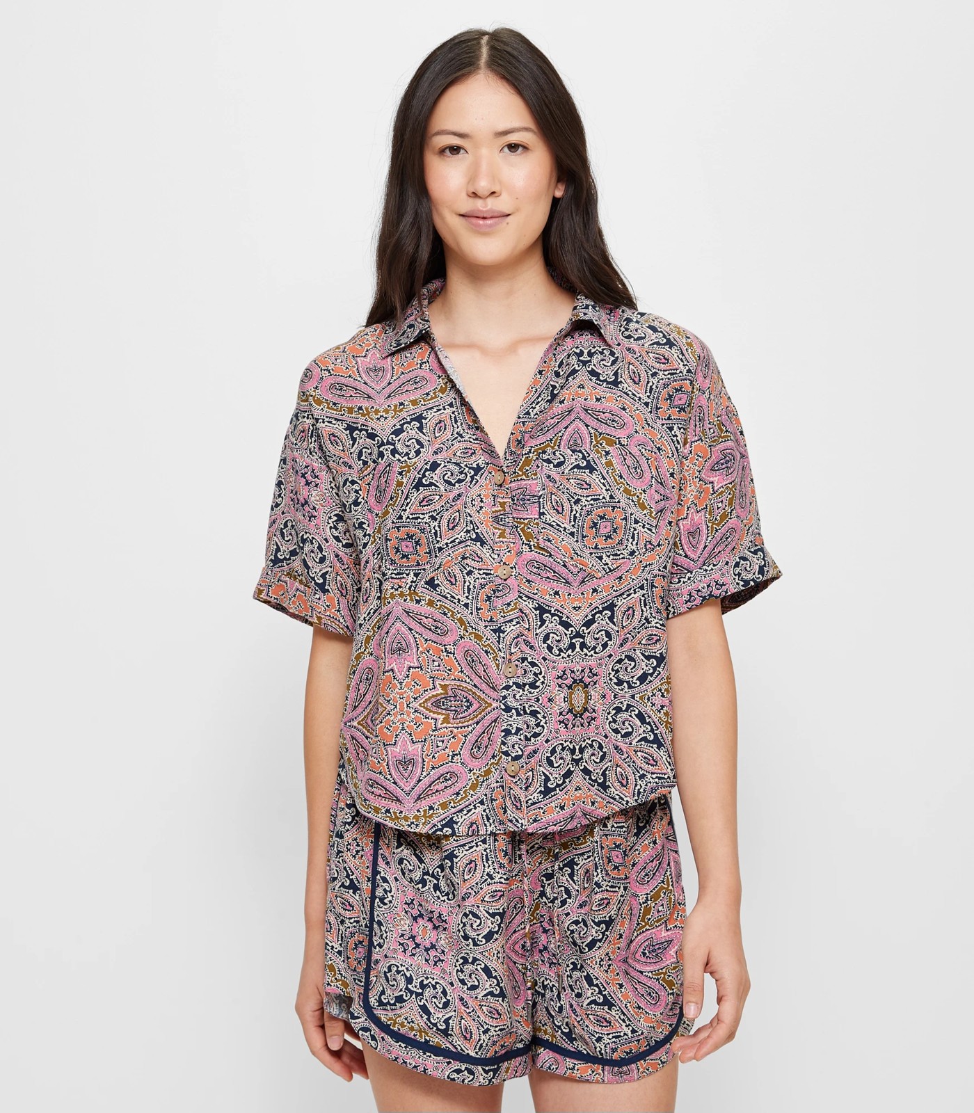 Indulge in laid-back luxury with the Linen Blend Patch Pocket Resort Shirt. Crafted from a sumptuous blend of viscose and linen, it offers a regular fit and a winter tile pattern. The round collared neckline with front v-drop adds a touch of elegance, while the drop shoulder and short roll cuff sleeves ensure a relaxed feel. Designed with practicality in mind, it features a button through front and open front chest pockets. Embrace effortless style and comfort with this timeless piece. Treat yourself to the ultimate relaxation and sophistication.