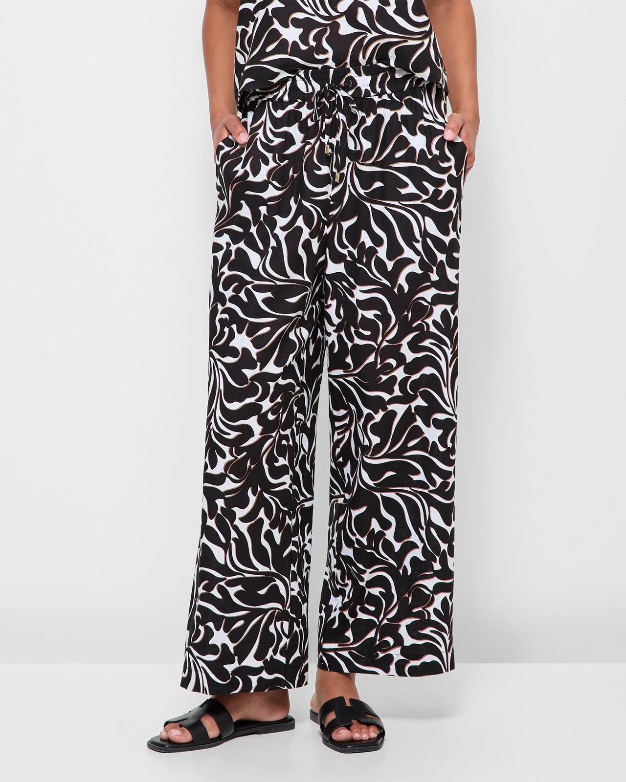 Discover the perfect blend of comfort and style with our Linen Blend Printed Trousers. Featuring a breathable linen-viscose mix, these trousers are ideal for warm weather. The elegant Myra leaves print adds a touch of sophistication. Enjoy easy wear with the pull-on design and a high-waisted fit, complemented by a thick elastic waistband and drawstring. With practical side seam pockets and a straight cut leg, these culottes are a must-have for any wardrobe. Make them yours today.