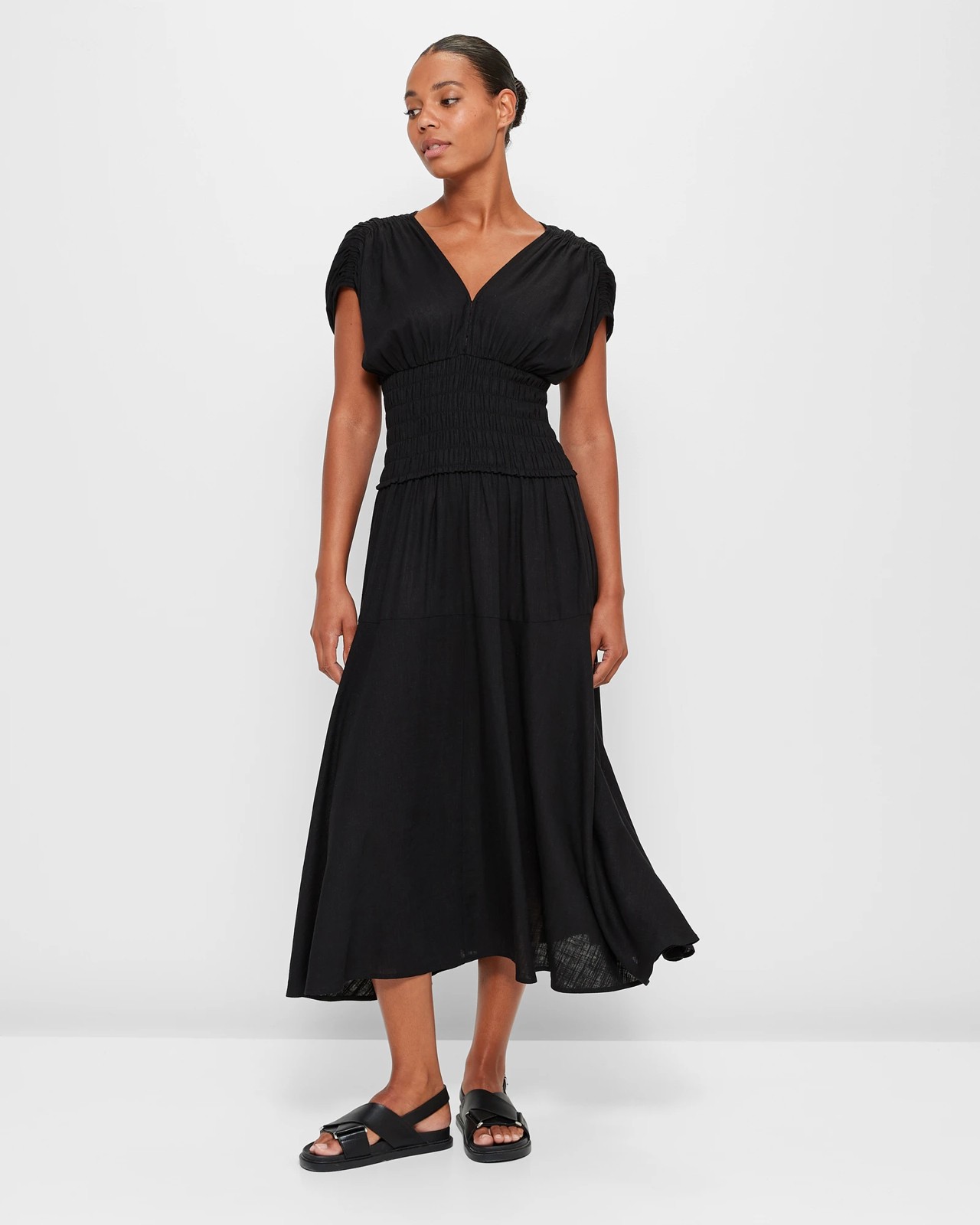 The Preview Linen Blend Shirred Waist Midi Dress is an elegant and feminine piece you can wear for all occasions. This dress is made from a luxurious blend of viscose and linen, making it lightweight and breathable. It features a regular fit with a v-neckline, short cap sleeves, thick shirred waistband and a midi length straight hemline. The shirring detail from the neck to shoulder creates a flattering silhouette that will make you feel like your best self. Perfect for summer days or nights, this dress is sure to turn heads!