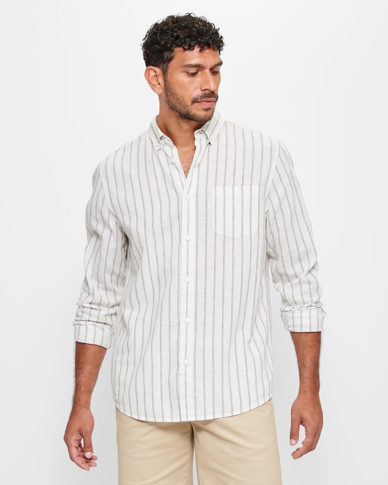 Upgrade your wardrobe with our Linen Blend Shirt for men. Crafted from a soft and breathable blend of linen and cotton, this shirt offers ultimate comfort throughout the day. The regular fit and grey and white stripe print make it a versatile addition to your collection. Featuring a collared neckline and button-through front, this shirt is both stylish and functional. The long sleeves with buttoned cuffs add a touch of sophistication. Get ready to make a statement with our Linen Blend Shirt.