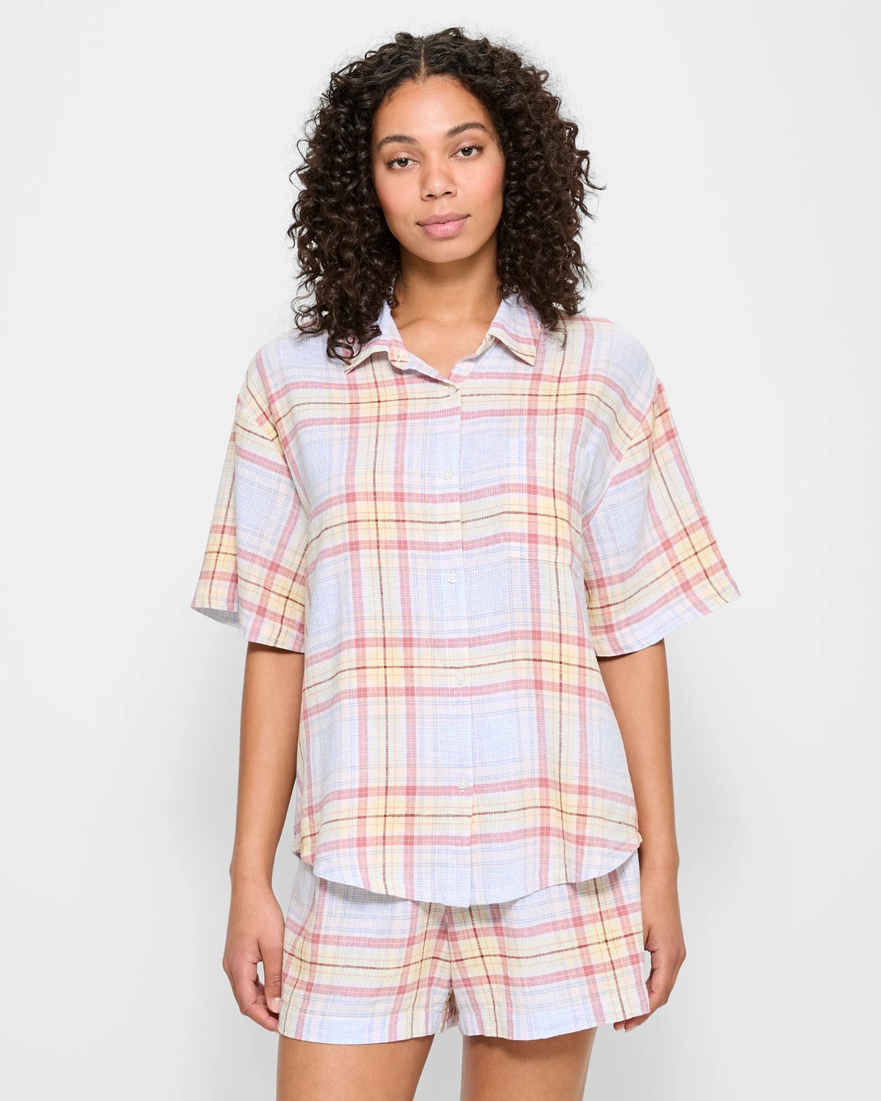 Introducing our perfect pajama set! This two-piece set features and all over print for a classic and timeless look. Made from a breathable linen and viscose blended fabrication, it offers superior comfort and style. The top has a regular fit with short sleeves that are perfect for those warmer nights. Whether you’re lounging around the house or getting ready for bed, this Linen Short Sleeve Pyjama Set is sure to keep you feeling comfy and stylish all night long!