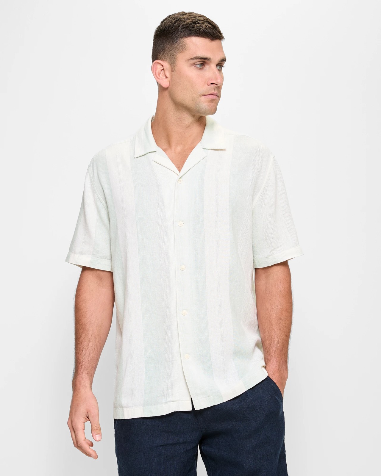 Step up your style game with our Linen Blend Textured Stripe Revere Shirt. Made from a luxurious linen and viscose blend, this shirt offers a combination of lightness and comfort. The vintage white backdrop is stylishly enhanced with green textured stripes. Designed with a round collared neckline, front lapels, and a button-through front, it features short sleeves and a straight hemline for a classic look. The back centre pleat adds a touch of sophistication and extra freedom of movement. Perfect for both casual and semi-formal occasions, this shirt is a must-have in your wardrobe. Update your look today.