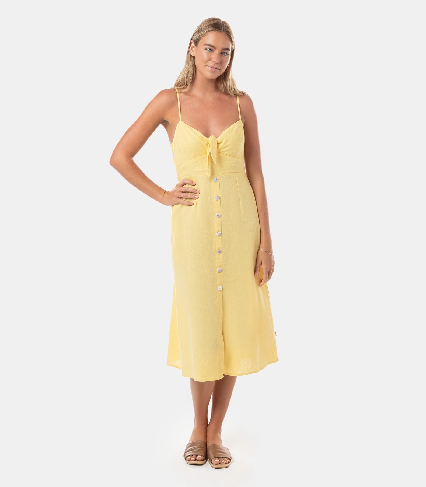 Piping Hot's best-selling midi dress now in a gorgeous yellow colourway. We love the flattering hemline and tie front detail. Made in a breathable linen-viscose blend for extra comfort and easy care.