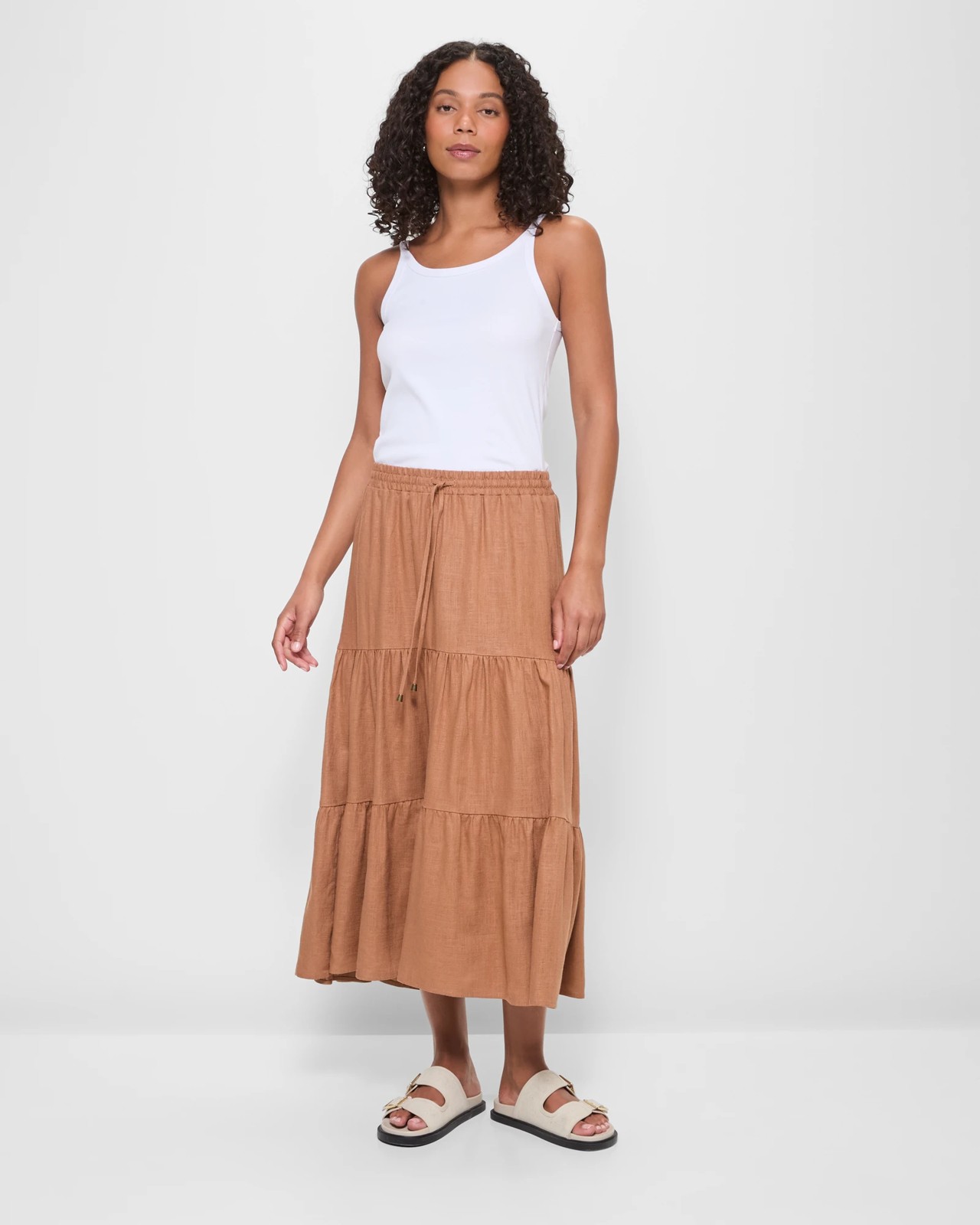 Discover the ultimate in comfort and style with our Linen Blend Tiered Maxi Skirt. Perfect for any occasion, this skirt features a light and breathable fabric that's perfect for warm days. The regular fit and thick elastic waistband with drawstring ensure a snug, comfortable feel. With its delightful tiered panels and elegant maxi length, this skirt brings a graceful flow to your every step. Make it a staple in your wardrobe and enjoy easy, chic dressing all year round.