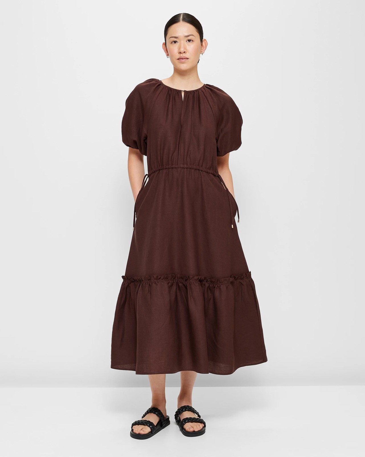 Cute for a day out with the girls, the Preview linen blend tiered drawstring midi dress has a lightweight linen rich fabric, a round neckline, short balloon sleeves and a midi length.