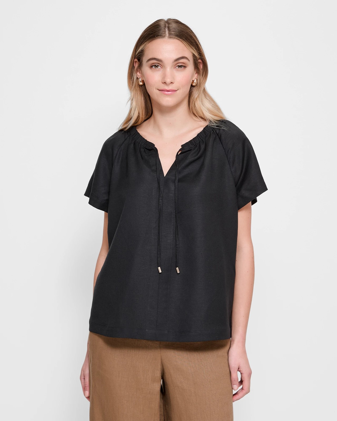 Introducing our Linen Blend V-Neck Blouse, a perfect combination of linen and viscose for comfort and an airy feel. This blouse offers a classic regular fit and a stylish v-neckline with an elegant tie at the centre, leading to a subtle keyhole detail. Its short sleeves and curved hemline add a touch of effortless charm. Ideal for both casual outings and smart occasions, this blouse will become your wardrobe staple. Enhance your style and feel your best with this versatile piece.