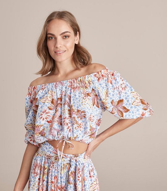 Made from a breathable and lightweight linen blended material, the off shoulder blouson blouse also features a cropped length and short elastic cuff sleeves.