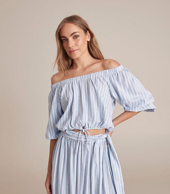 Made from a breathable and lightweight linen blended material, the off shoulder blouson blouse also features a cropped length and short elastic cuff sleeves.