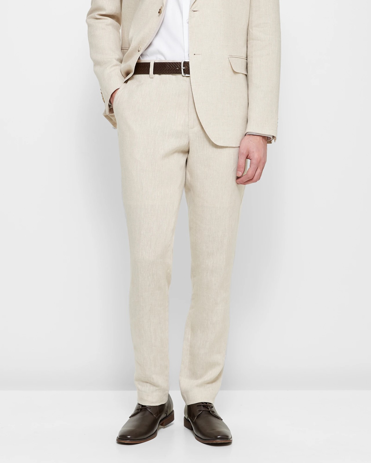 Upgrade your wardrobe with our comfortable linen suit trouser. Made from breathable linen, this trouser offers a soft touch fabric that provides added comfort all day long. It features a tailored fit and a structured waistband with belt loops for a natural and stylish look. The functional fly front with a clasp and button closure adds convenience, while the two front pockets and two buttoned back pockets offer ample storage. Perfect for any occasion, this linen suit trouser is a must-have in your wardrobe!