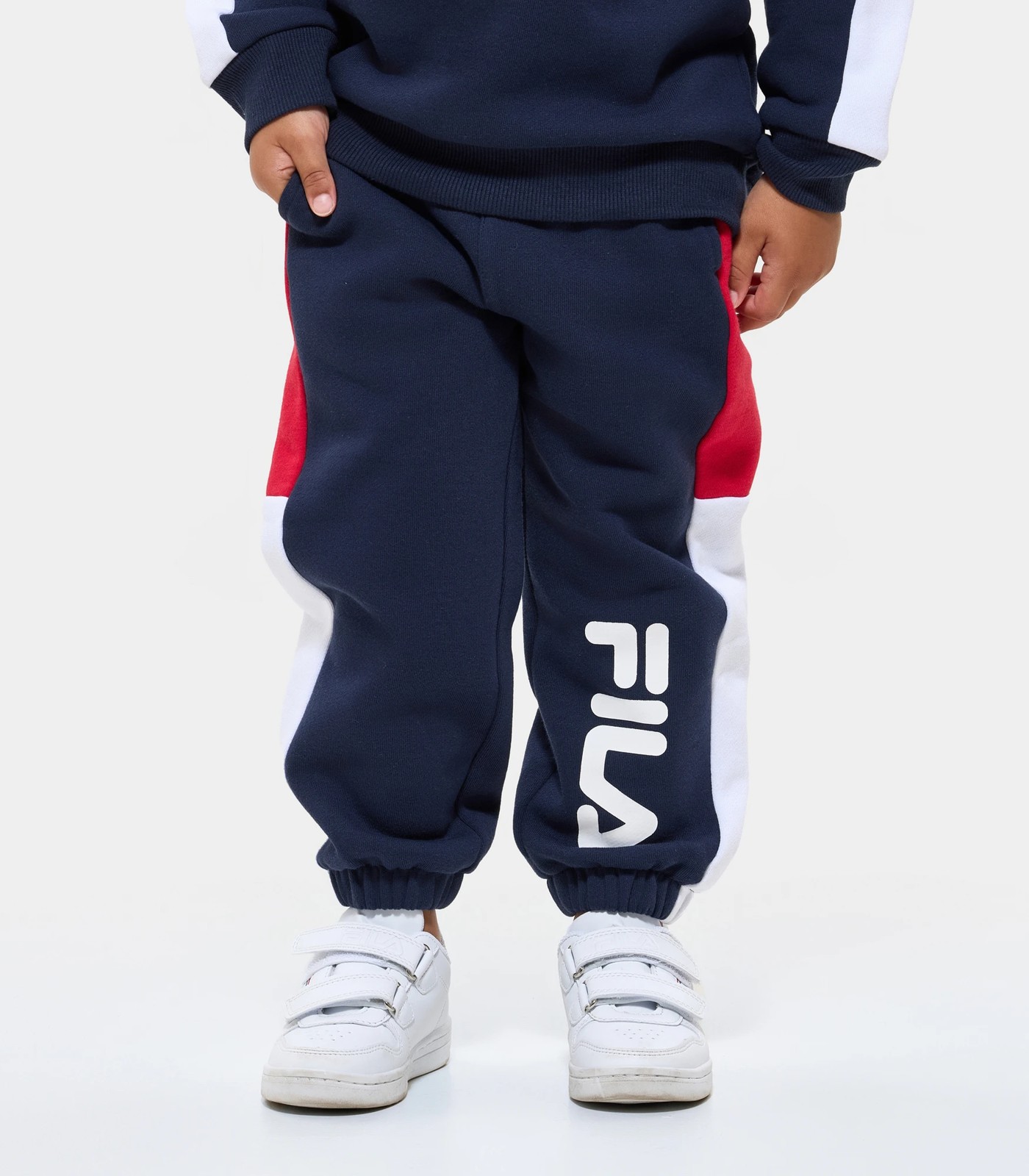 The Fila Logan trackpants are crafted from a blend of Cotton Polyester Brushed Fleece, offering a soft and cosy feel. These trackpants showcase contrast splicing on the side legs, creating a stylish and eye-catching appeal. The in-seam pockets provide convenient storage for his essentials, while the elasticated waistband and external functional drawcord ensure a secure and adjustable fit. The elasticated cuffs offer ankle comfort throughout the day. Completed with a large Fila print on the left leg, these trackpants make a bold branding statement. Dress your little one in these comfortable and trendy Fila Logan trackpants and let him showcase his style with confidence. Effortlessly pair back with our Logan crew (sold separately) in a matching colourway for the complete look.