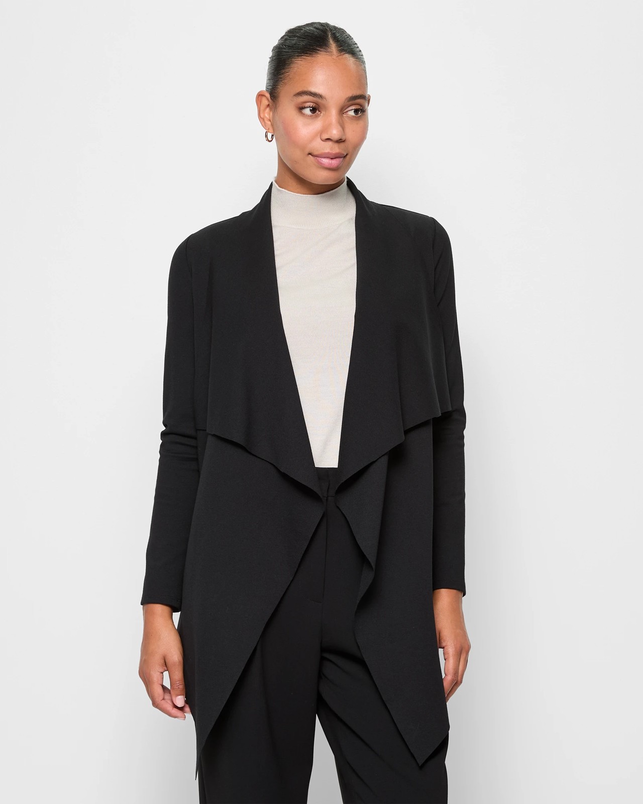 Experience unparalleled comfort and style with our Long Ponte Waterfall Cardigan. This beautifully designed cardigan is made from a soft viscose and nylon blend, including a touch of elastane for ideal stretch. Its regular fit and elegant rounded waterfall collar create a unique look, while the open front design and long sleeves add a touch of sophistication. With convenient side seam pockets and a versatile mid-length, this black cardigan seamlessly transitions from casual to chic. Refresh your wardrobe with this timeless piece - indulge yourself today.