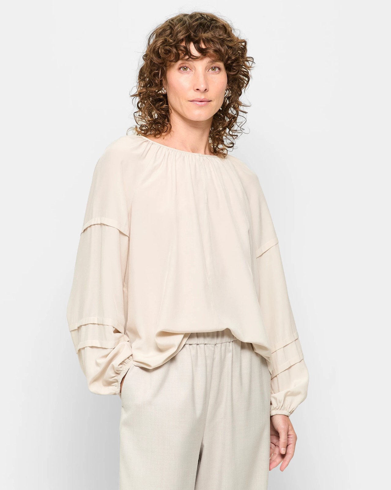 Discover the perfect blend of comfort and style with our Long Sleeve Blouson Blouse. This versatile blouse features a lightweight fabric, creating an easy fit that's ideal for any occasion. With its round neckline and delicate pleating on the sleeves, it offers a refined and polished look. The gathering detail under the neck adds a touch of sophistication, and the elastic cuffs provide a hint of elegance. Make this timeless piece a staple in your wardrobe and enjoy a beautifully relaxed appearance. Order yours now to experience the charm firsthand.