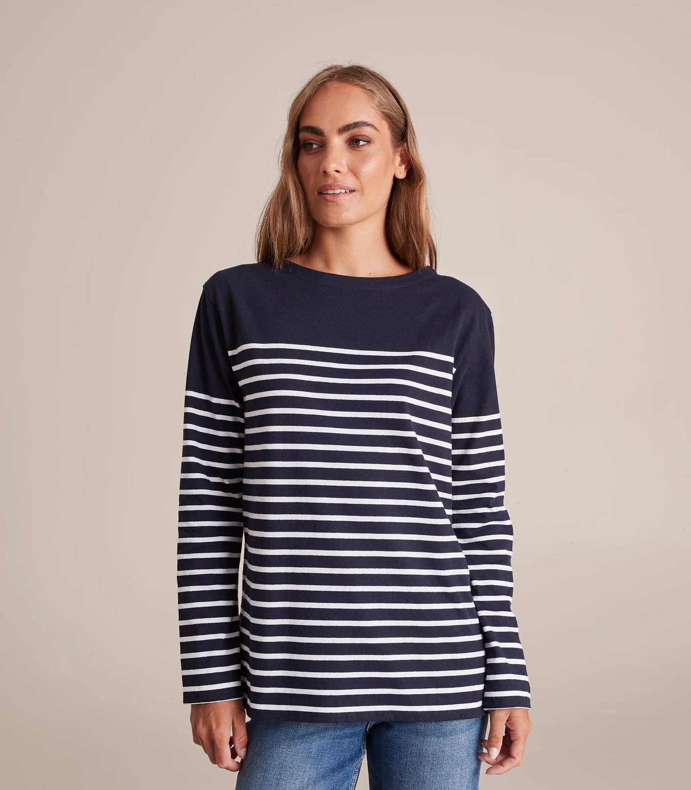 A great top to be worn on its own or for layering in the colder months, the boat neck top has an all over stripe design, a lightweight cotton fabrication, a boat neckline and long sleeves for coverage.