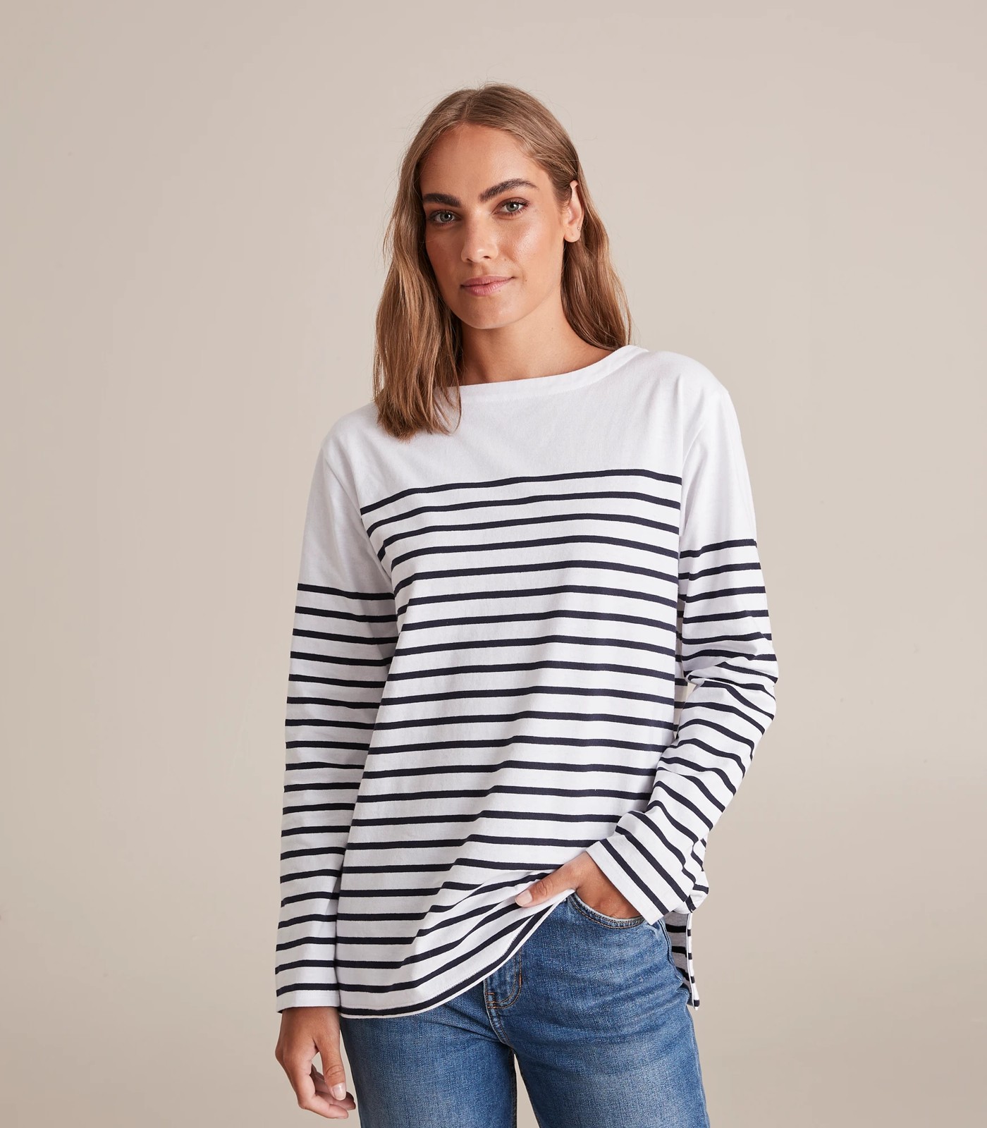 A great top to be worn on its own or for layering in the colder months, the boat neck top has an all over stripe design, a lightweight cotton fabrication, a boat neckline and long sleeves for coverage.