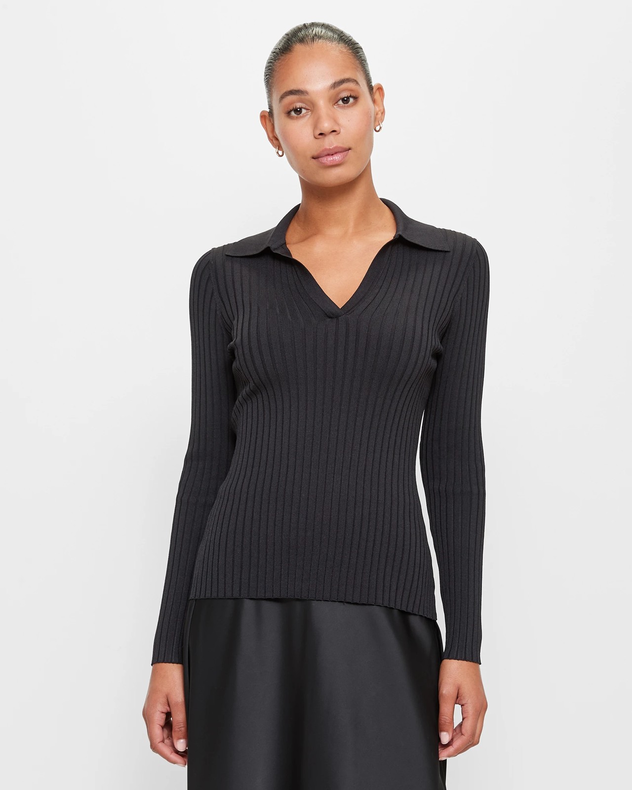 Indulge in the luxurious comfort of our exclusive long sleeve polo neck top. Crafted from a premium viscose and nylon blend, the all-over ribbed crepe design ensures a flattering and slim fit. The round collared neckline with a v-front drop exudes elegance, while the straight hemline adds a touch of sophistication. With its classic yet trendy style, you'll be ready to make a fashion statement wherever you are. Elevate your wardrobe with our exclusive textured polo neck top today!