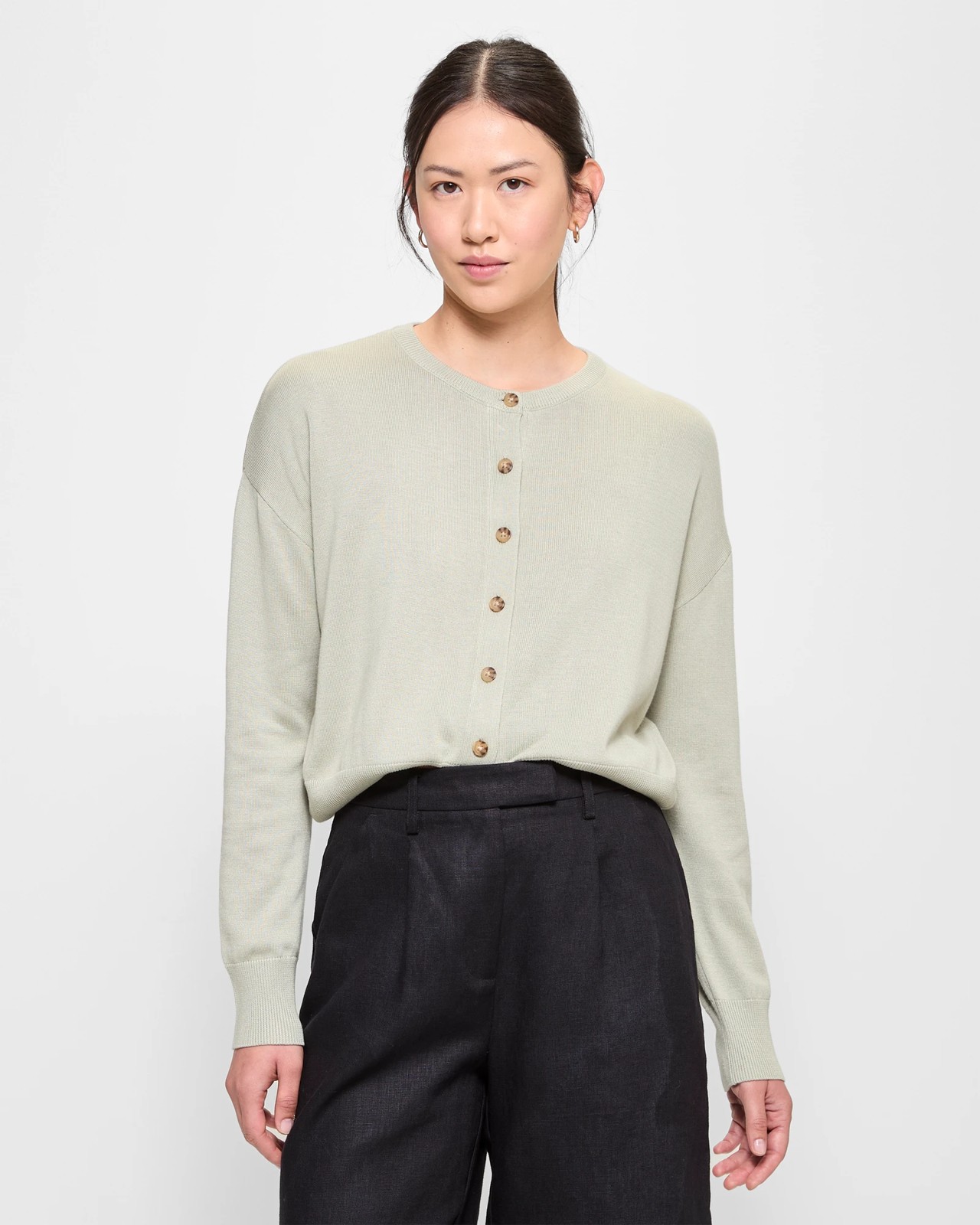Experience ultimate comfort with our Long Sleeve Crew Neck Rib Cardigan. Designed from a perfect blend of viscose and cotton, this cardigan features LENZING ECOVERO viscose fibres for a soft touch. With its all-over knit design, ribbed crew neckline, and button-through front, this cardigan offers a regular fit and long sleeves with ribbed cuffs. The thick, ribbed straight hemline adds finishing touches, making it a versatile addition to your wardrobe. Treat yourself to this cosy layer today.