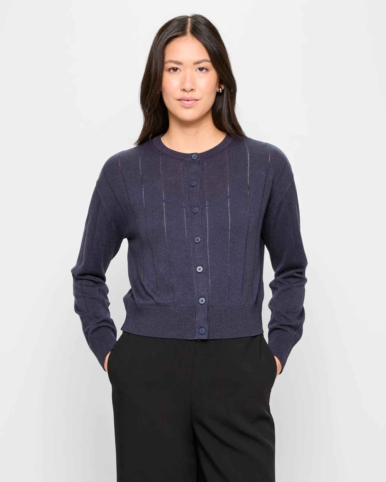 Enhance your wardrobe with the Long Sleeve Crew Neck Rib Cardigan by Preview. Made from a rich blend of viscose and cotton, this lightweight cardigan features a ribbed texture throughout, delivering both style and comfort. The Oxford blue shade adds a sophisticated touch, making it perfect for any occasion. Its regular fit and button-through front make layering a breeze, while the ribbed cuffs and straight hemline offer a timeless finish. Perfect for cool evenings or casual days, this cardigan is a versatile must-have addition to any fashion-forward collection. Don't miss out on this adaptable piece.