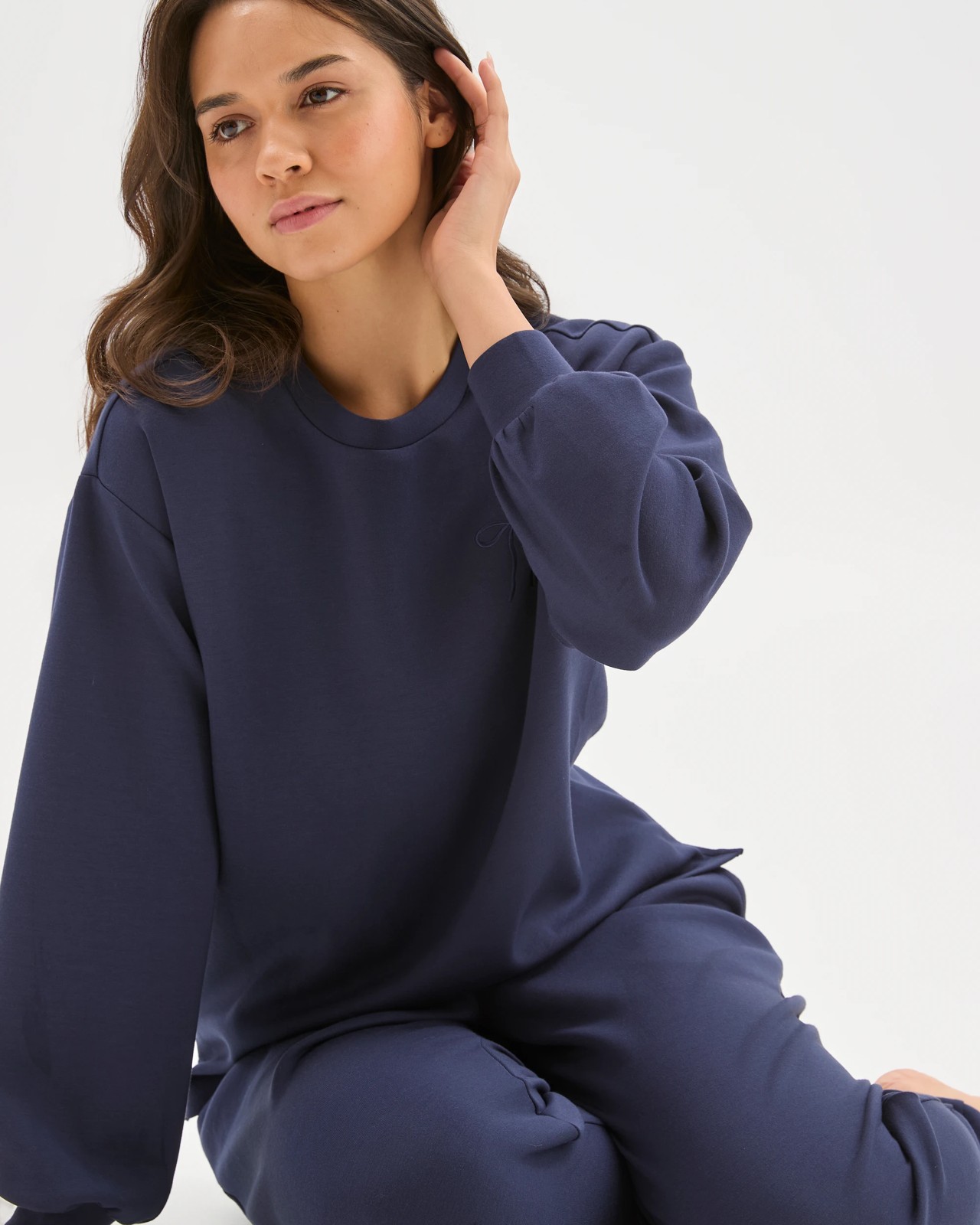Discover comfort with the Long Sleeve Crew Sleep Sweatshirt Experience relaxation with our Long Sleeve Crew Sleep Sweatshirt, made from a soft blend to ensure stretch and comfort. Its soft and silky texture makes it the perfect companion for winding down. The crew neckline and long cuffed sleeves provide a chic finish, while the bold chest embroidery reminds you, It's All Good. Whether you're lounging at home or preparing for a restful night, this regular-fit sweatshirt with small side seam splits will make a great pick. Get yours now for a great relaxation routine!