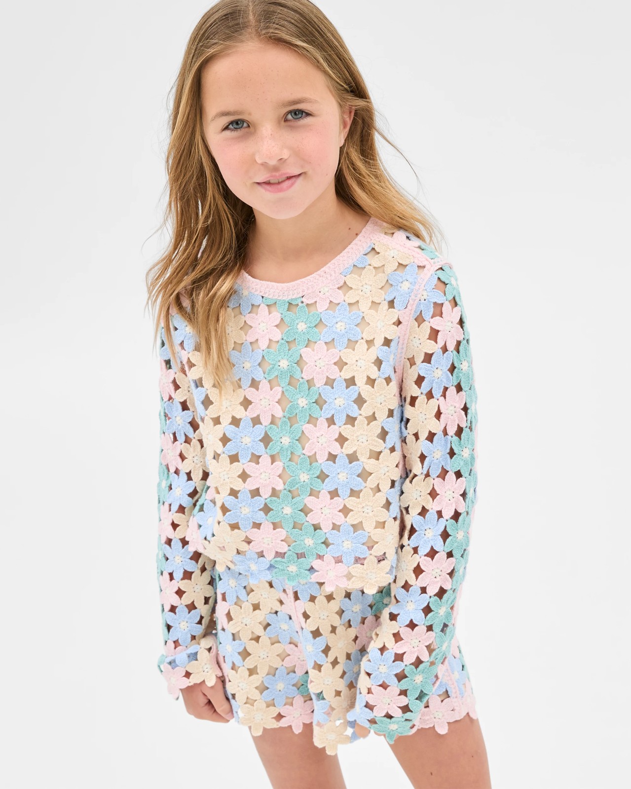 This charming Long Sleeve Crochet Knit Top is a delightful addition to any young girl's wardrobe. Crafted from a blend of 60% Australian cotton and 40% acrylic, it offers a soft and cozy feel that ensures comfort throughout the day. The top features an intricate crochet flower pattern that adds a touch of whimsy and style, making it perfect for both casual outings and more special occasions. The classic crew neck and long sleeves provide a comfortable fit, while the straight hemline adds a polished finish to the overall design. Ideal for layering in cooler weather or wearing alone, this versatile piece pairs beautifully with jeans, skirts, or shorts. Treat your little one to this adorable knit top that will surely brighten up her wardrobe and bring joy to her daily adventures.