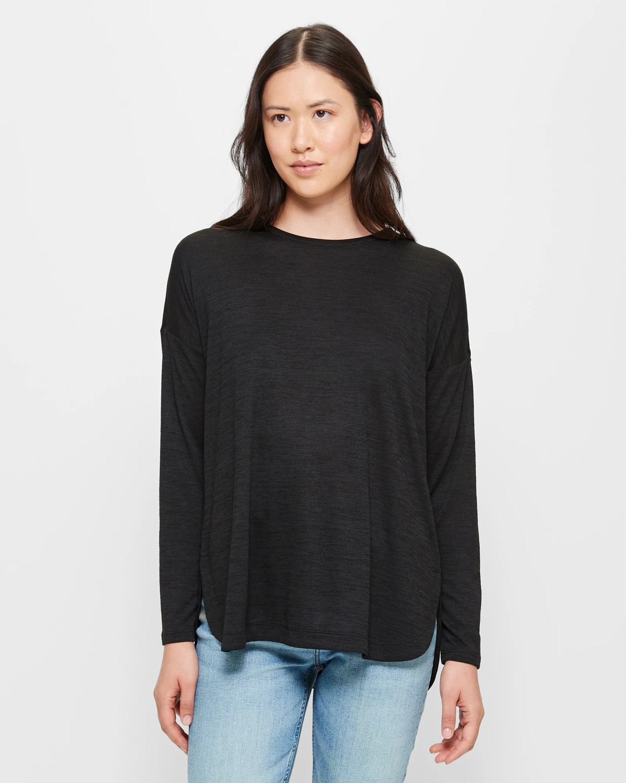 Introducing our brand new Long Sleeve Curved Hem Top for ladies. This stylish top is made from a high-quality blend of viscose and polyester, ensuring utmost comfort and durability. The lightweight design adds a touch of elegance to your outfit, while the regular fit provides a flattering silhouette. Featuring a ribbed crew neckline and drop shoulder, this top offers a modern twist to your wardrobe. The long sleeves keep you warm and cosy during colder days. And the standout feature? The curved high-low hemline, adding a unique and fashionable flair. Upgrade your wardrobe with our Long Sleeve Curved Hem Top today and be the trendsetter you were meant to be!