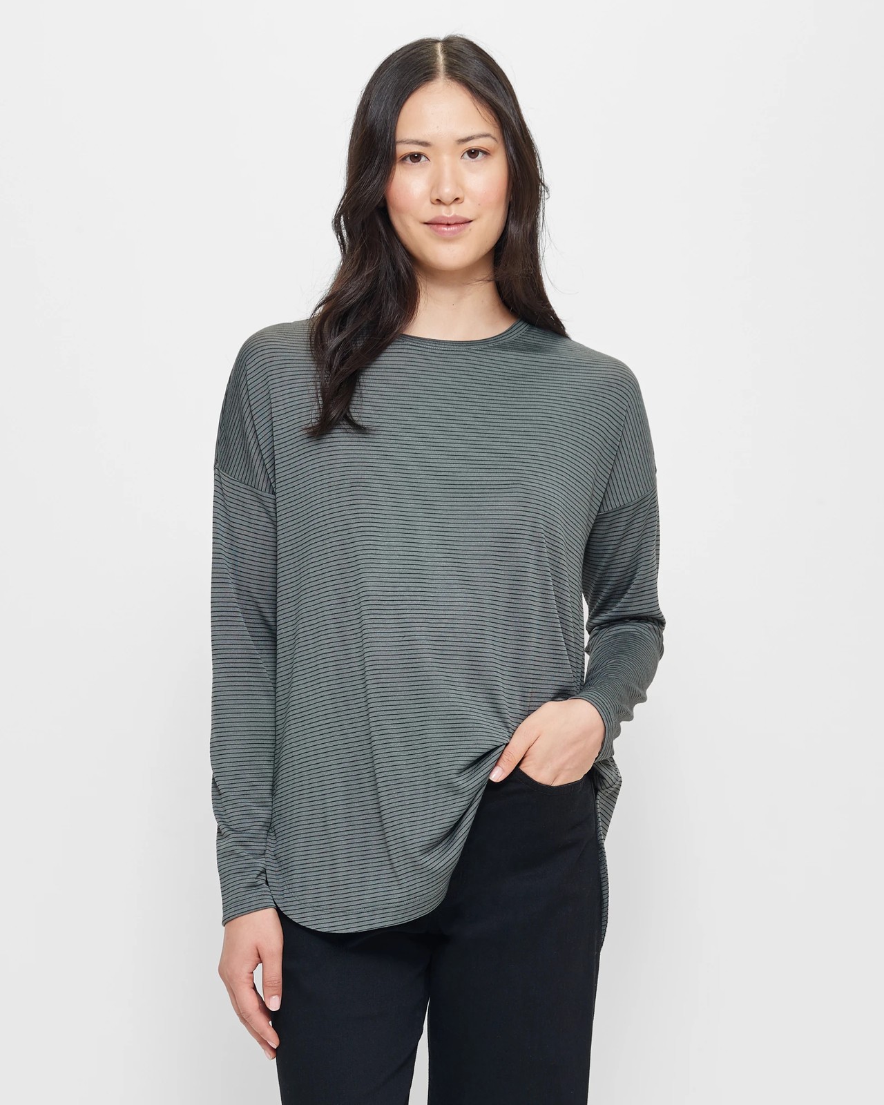 Introducing our brand new Long Sleeve Curved Hem Top for ladies. This stylish top is made from a high-quality blend of viscose and polyester, ensuring utmost comfort and durability. The lightweight design adds a touch of elegance to your outfit, while the regular fit provides a flattering silhouette. Featuring a ribbed crew neckline and drop shoulder, this top offers a modern twist to your wardrobe. The long sleeves keep you warm and cosy during colder days. And the standout feature? The curved high-low hemline, adding a unique and fashionable flair. Upgrade your wardrobe with our Long Sleeve Curved Hem Top today and be the trendsetter you were meant to be!