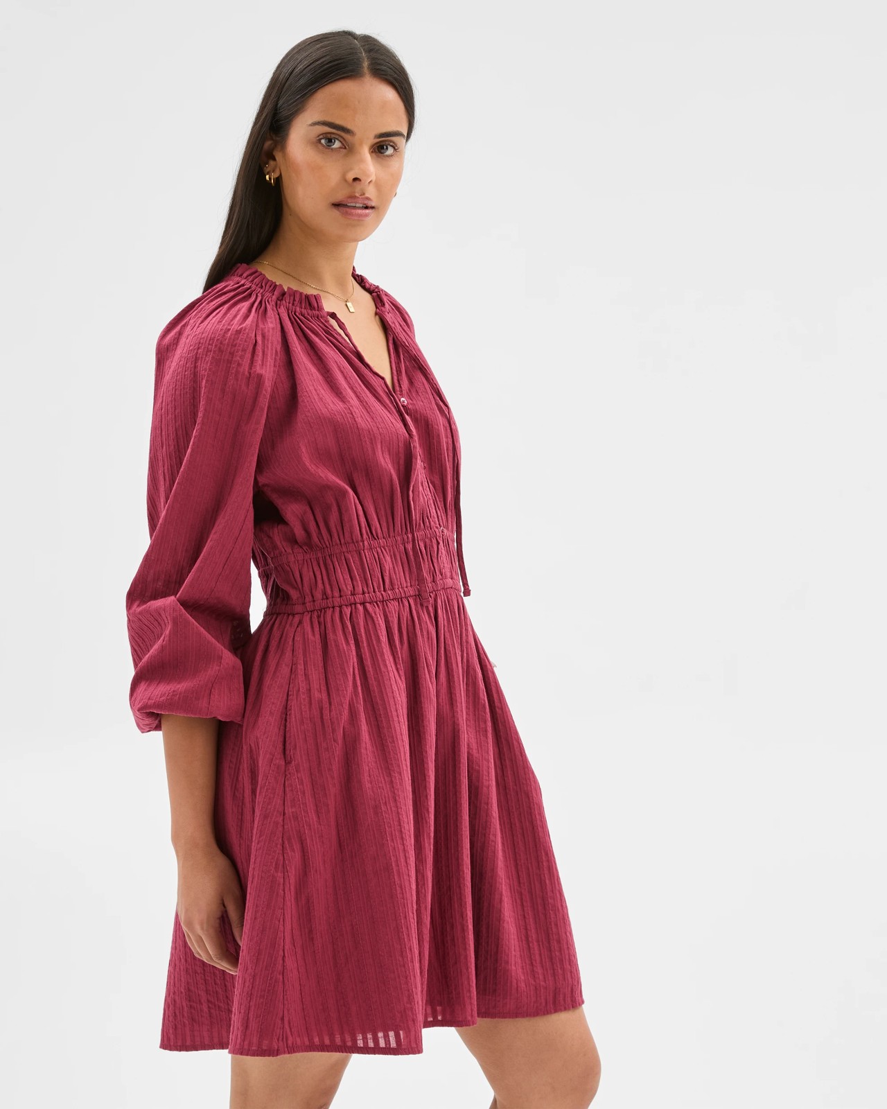 Bring a cheerful twist to your wardrobe with the Long Sleeve Dobby Detail Mini Dress. This regular fit dress is made from soft cotton dobby, offering all-day comfort and a charming textured look. The mini length and straight hemline give it a lively, youthful vibe. A round neckline with a v-front drop and centre tie front creates an inviting focal point, while the button-down design and double thin elastic waist enhance the overall shape. Long sleeves with elastic cuffs provide easy movement and effortless style. With its fully lined interior, you can move through your day with ease and confidence. Treat yourself to a dress that brightens every moment – order yours today.