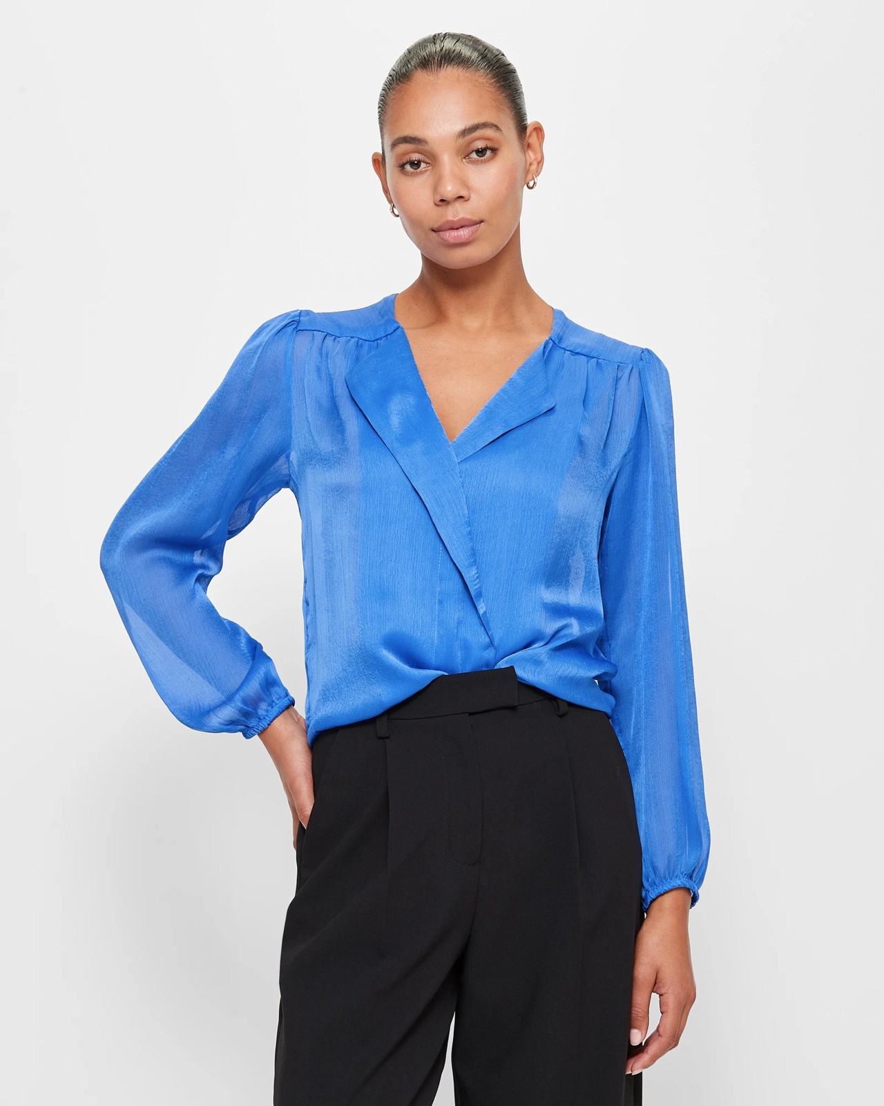 Imagine yourself confidently stepping out in style with our Long Sleeve Drape Neck Blouse. Crafted from a polyester blend that includes recycled materials, the blouse exudes elegance and sustainability. Its lightweight sheer fabric provides comfort, while the regular fit and cross over front enhance your silhouette. The blouse features a round neckline with stylish front fold-over lapels, gathering across shoulders, and long elastic cuff sleeves for added charm. Complete your look with the high-low hemline that adds a touch of flair. Elevate your wardrobe with our versatile and chic blouse today!