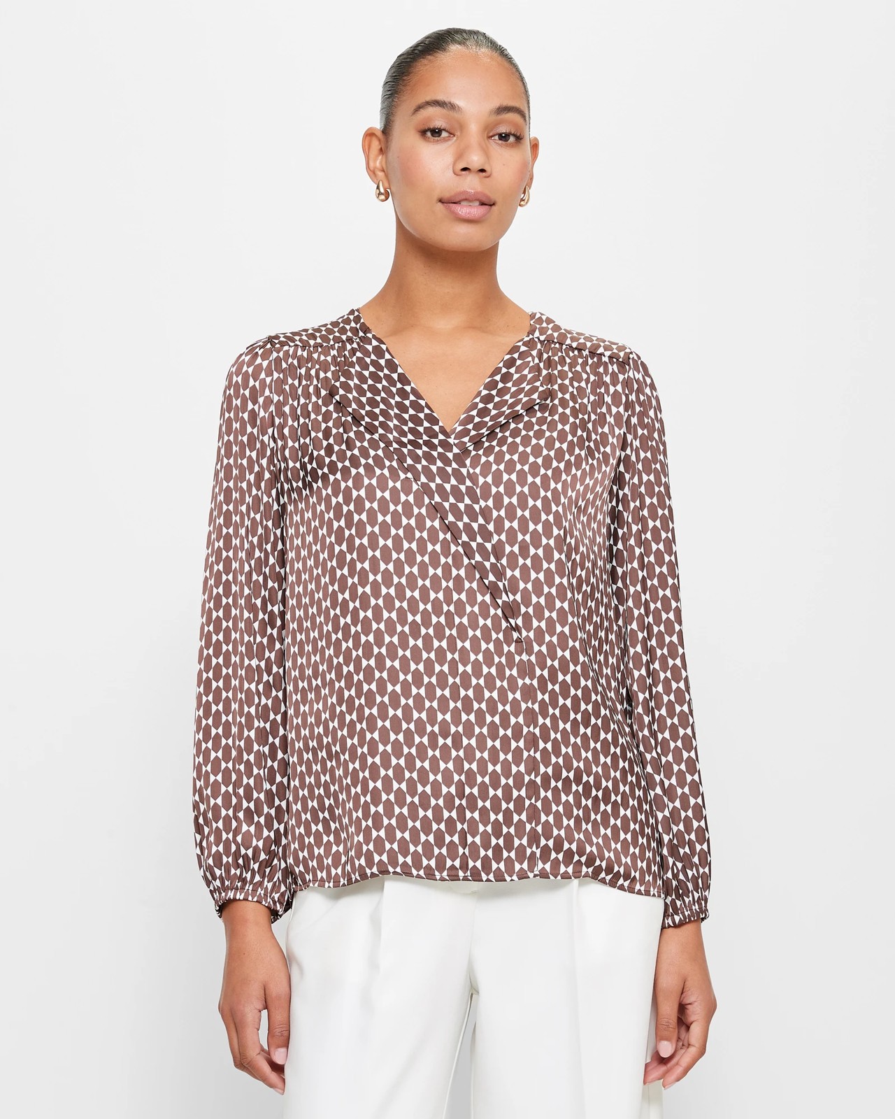 Introducing our Long Sleeve Drape Neck Blouse by Preview. Crafted from a luxurious polyester fabric with a soft satin finish, our blouse offers a regular fit for all-day comfort. The elegant round neckline features a stylish front v-drop, while the cross over front with lapels and gathering details add a touch of sophistication. The long elastic cuff sleeves and straight hemline complete the look. Elevate your wardrobe with versatile elegance and shop our Long Sleeve Drape Neck Blouse now!