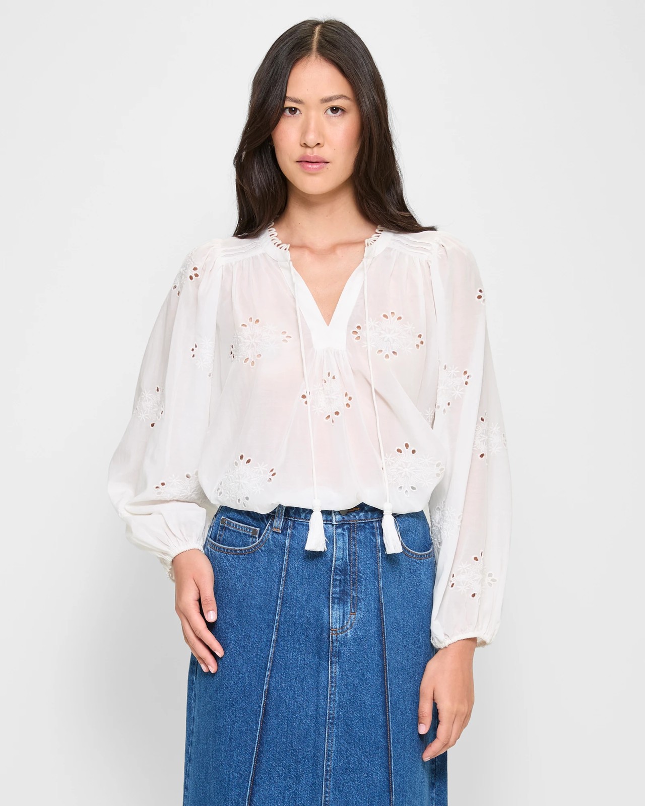 Immerse yourself in elegance with our Long Sleeve Embroidered Peasant Blouse. Crafted from a luxurious viscose/cotton blend, enjoy a lightweight and airy feel while exuding style effortlessly. The intricate all-over embroidered design adds a touch of artistry, while the relaxed fit and gathering details ensure a comfortable yet sophisticated look. Elevate your wardrobe with the round neckline, V-drop front, and high-low hemline. Embrace versatility with the chic blouse that seamlessly transitions from day to night!