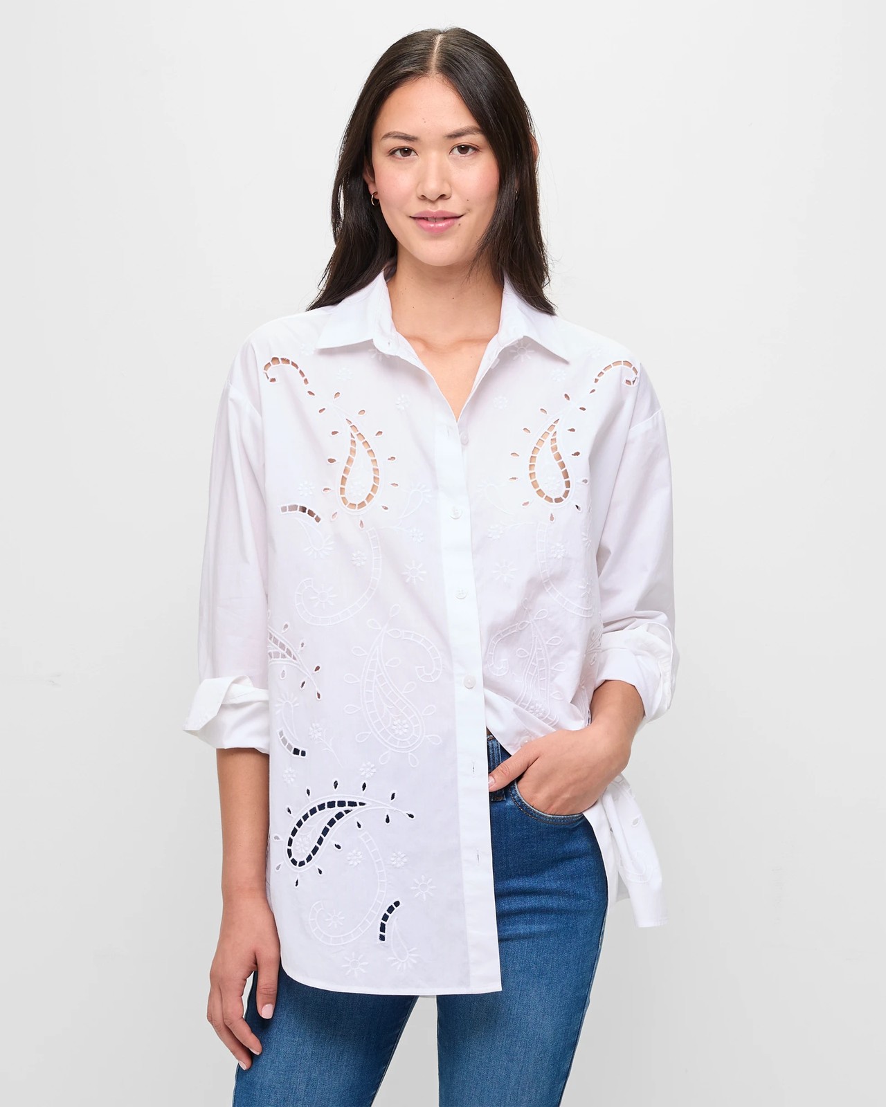 Experience unmatched comfort with our Women's Long Sleeve Embroidered Shirt, designed from high-quality cotton for a lightweight and breathable wear. This regular fit shirt in timeless white features an elegant round collar and a button-down front, adorned with intricate embroidery on the front. Perfectly detailed with long button-cuffed sleeves and a curved hem, it also offers a back centre pleat for enhanced movement. Revamp your wardrobe with this classic piece and enjoy an ideal blend of style and comfort. Don't miss the chance to add it to your collection today!