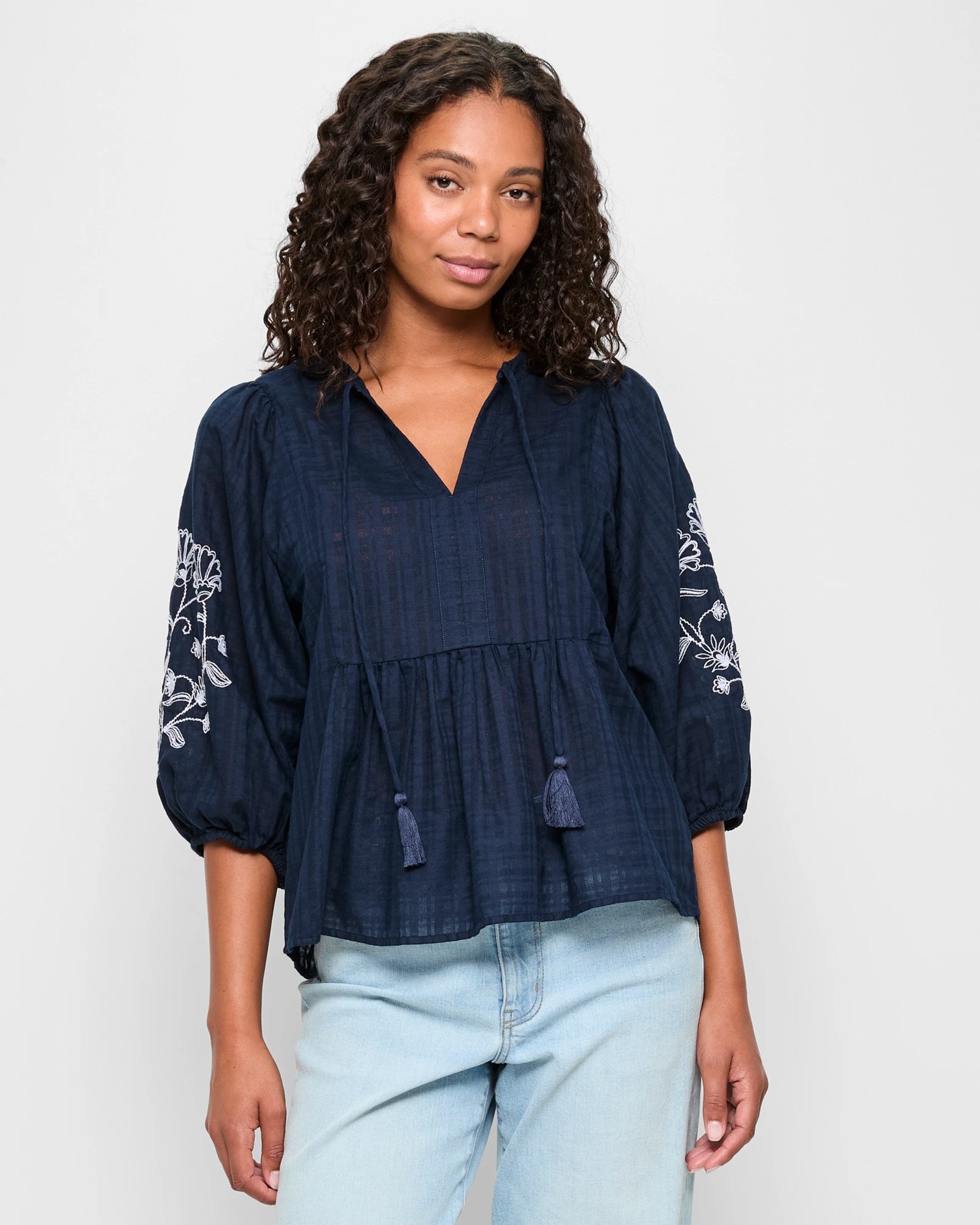 Discover the perfect mix of style and comfort with this Long Sleeve Embroidered Top. Made from a soft cotton-polyester blend, this top offers breathable wear for everyday comfort. Its delightful night sky blue shade is highlighted with intricate white embroidery, making it a versatile piece for any wardrobe. The round neckline featuring a tie-up centre and keyhole adds a touch of sophistication. Enjoy the fashionable puff sleeves with elastic cuffs and the charming gathering around the waist. Pair it with your favourite jeans or a skirt and step out in style. Get yours today and enjoy the perfect fusion of classic and contemporary fashion.