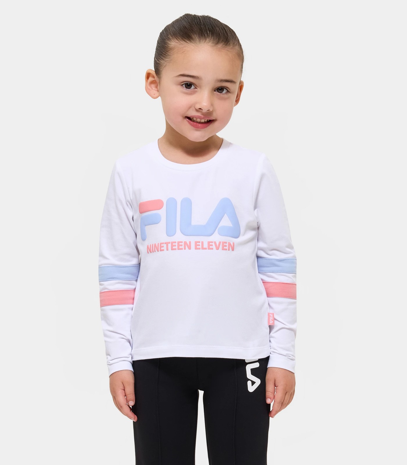 This adorable little Girl's Zara long sleeve is the perfect addition to any little one's wardrobe. Featuring a large Fila puff print to the chest and contrast binds to sleeves. With its classic silhouette and lightweight material, this top is sure to be a favourite all year round! For a casual and comfy fit for your daughter, effortlessly pair this top with the Zara flare pant (sold separately).