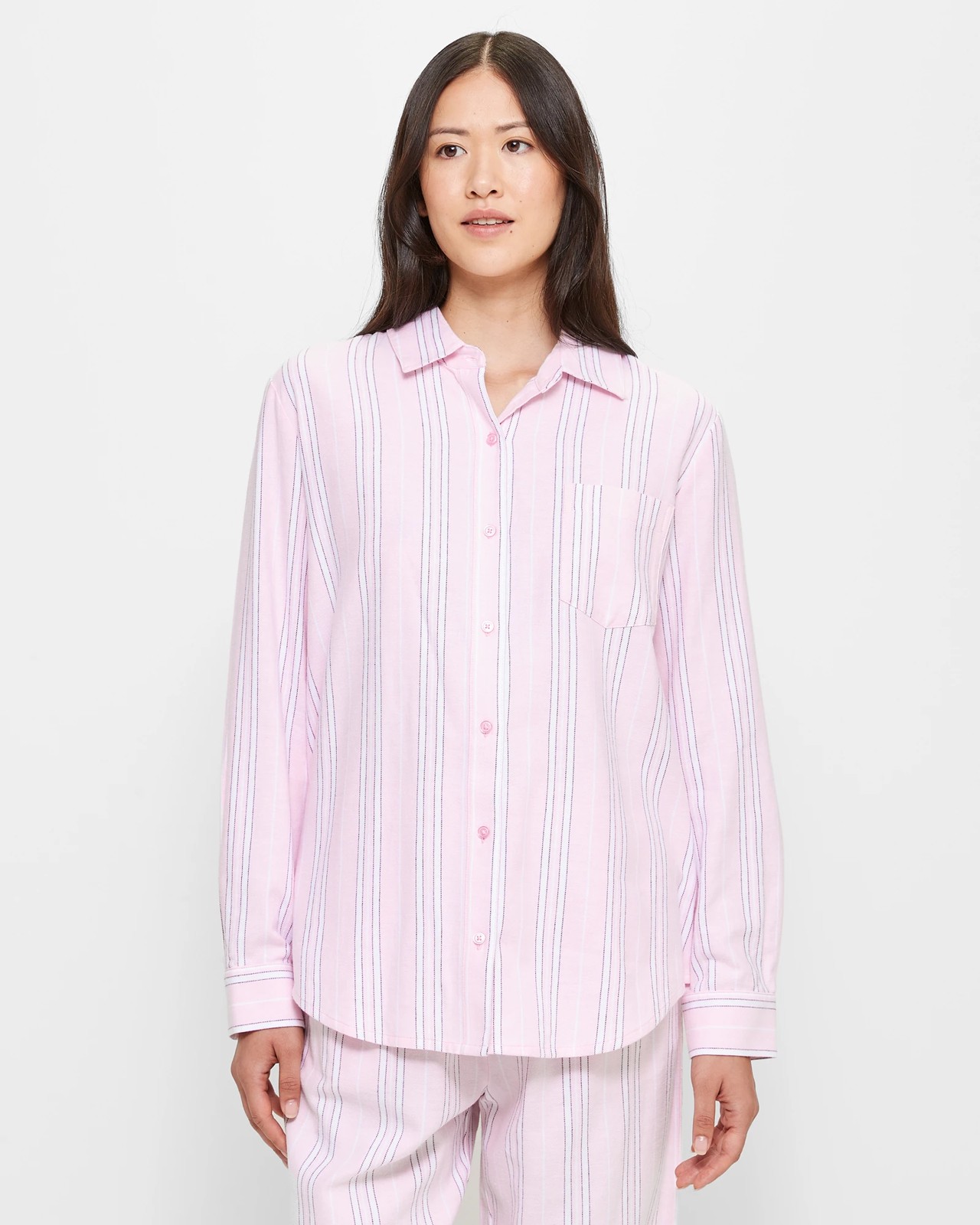 Experience unrivalled comfort and style with the Long Sleeve Flannelette Pyjama Shirt. Crafted from a soft cotton fabrication, this sleep top offers a regular fit for ultimate relaxation. The stylish check print adds a touch of sophistication to your bedtime routine. Featuring a round collared neckline and long button cuffed sleeves, this shirt ensures a cosy and customizable fit. The button through front and open chest pocket further enhance the functionality of this piece. Complete the look by pairing it with the matching sleep pants (sold separately) for a cohesive and fashionable ensemble. Upgrade your sleepwear collection with this versatile and comfortable pyjama shirt. Sleep peacefully and wake up refreshed. Shop now!