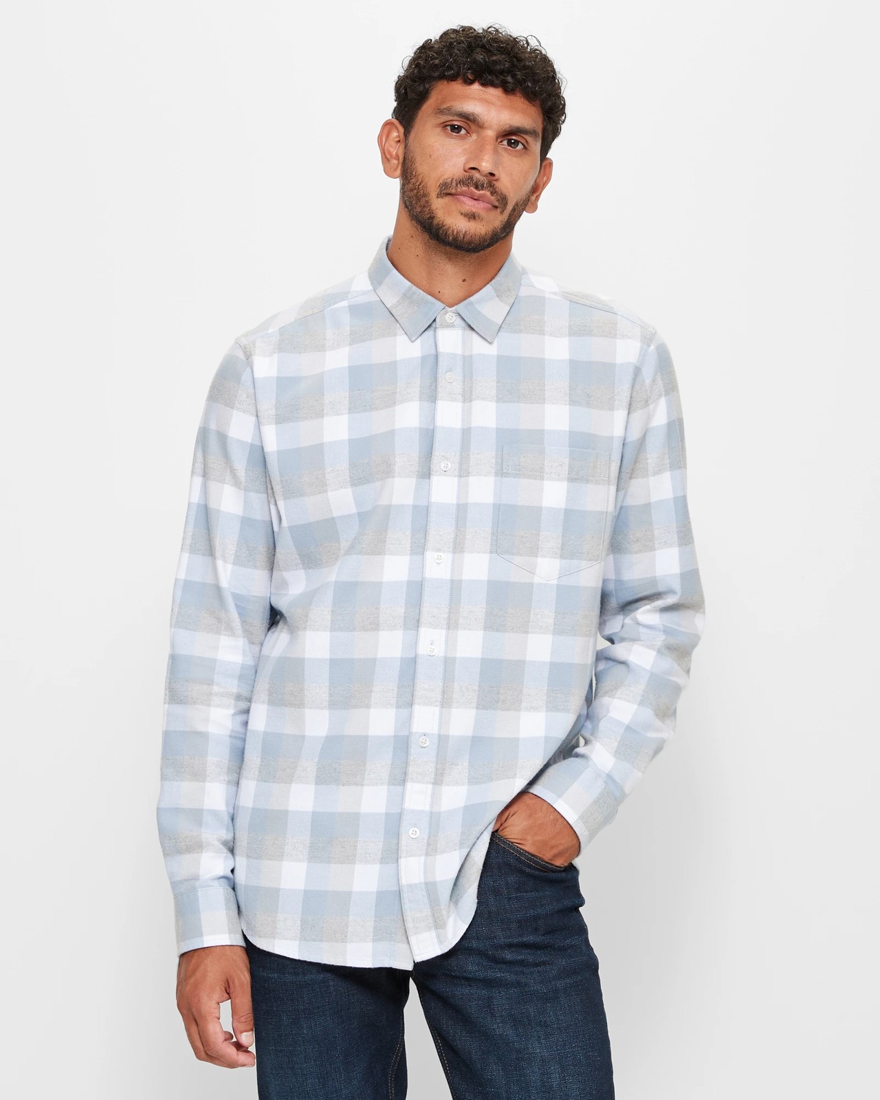 Elevate your casual wardrobe with our Long Sleeve Flannelette Shirt. Made from a premium cotton fabrication, this shirt features a double brushed design for added softness and warmth. With its regular fit and light blue colour, it is a versatile piece that can be dressed up or down. The all over check print adds a stylish touch, while the round collared neckline and long button cuff sleeves provide a classic look. The button through front and open chest pocket complete the design. Finished with a curved hemline and a back centre pleat for added movement, this shirt offers both style and comfort. Upgrade your shirt collection and add this timeless piece to your wardrobe today.