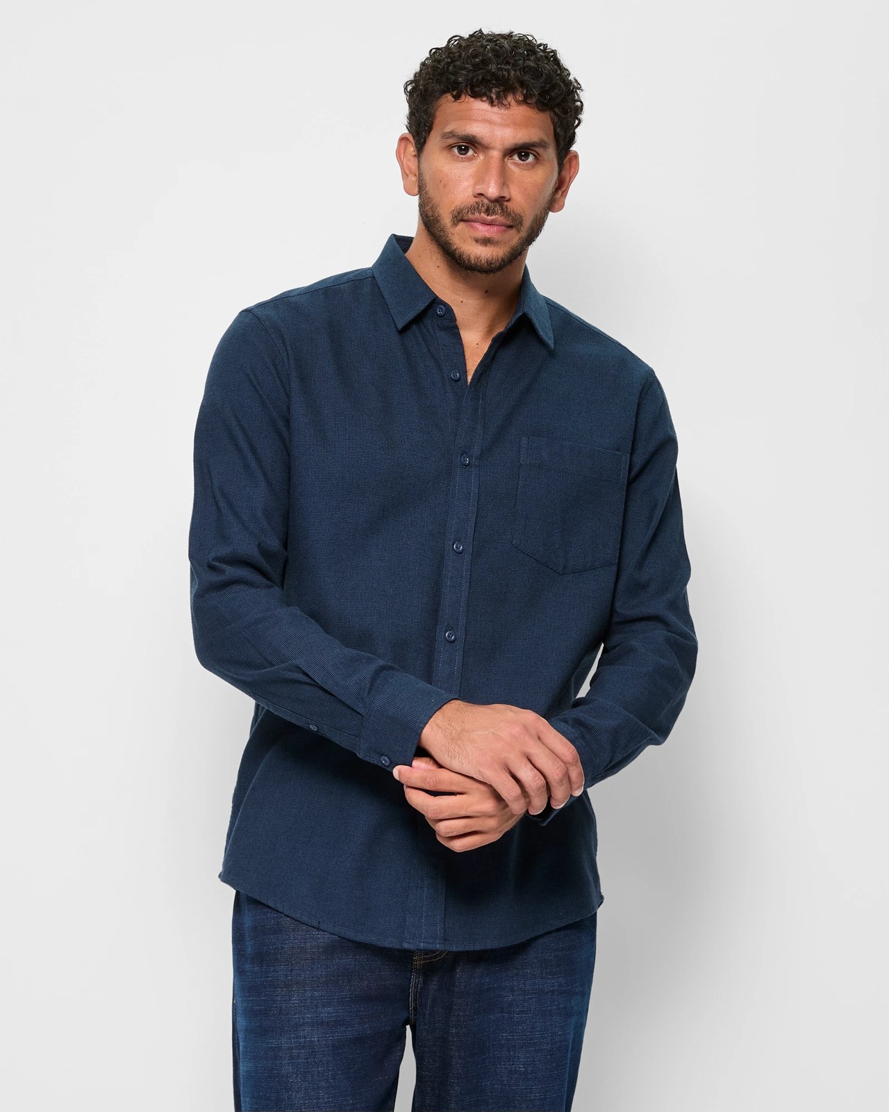 Discover the perfect blend of comfort and style with our Long Sleeve Flannelette Shirt. Made from soft cotton, this shirt features a double-brushed design that feels gentle against the skin. Its classic navy blue hue makes it a versatile addition to your wardrobe, suitable for both casual outings and smart-casual events. The regular fit, round collared neckline, and button-through front offer a timeless look, while the curved hemline and back centre pleat ensure ease of movement. Complete with a practical open chest pocket and long button-cuffed sleeves, this shirt is as functional as it is fashionable. Enhance your everyday style—add this shirt to your collection today.
