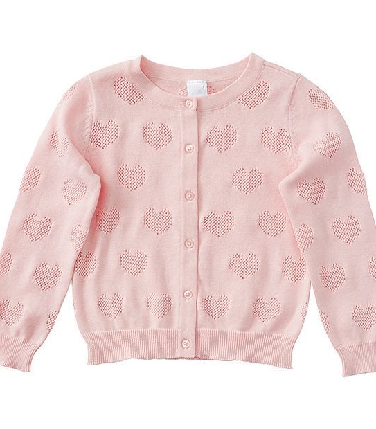 From the Caribbean Culture collection comes this beautiful cotton knit cardigan to complete her outfit. Features include and all-over heart design, full button front, round neck, ribbed cuffs and hem.