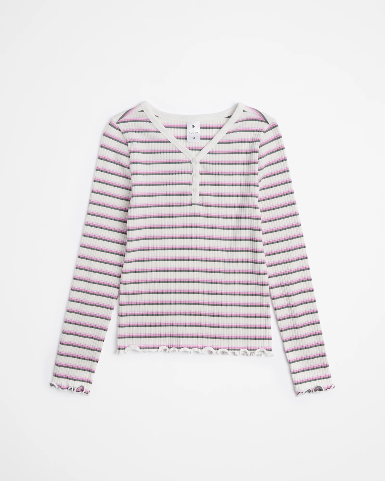 This Long Sleeve Henley Rib Top is a must-have addition to any girl's wardrobe. Made from a cotton-rich fabric with stretch, it offers incredible comfort and freedom of movement. The V-neck Henley collar adds a stylish touch, while the long sleeves with lettuce cuffs add a feminine and fashionable detail. The lettuce hemline provides a trendy and unique twist. Whether she's dressing up for a special occasion or just running errands, this top will keep her looking stylish and feeling comfortable. Upgrade her wardrobe today with this versatile and trendy Long Sleeve Henley Rib Top.