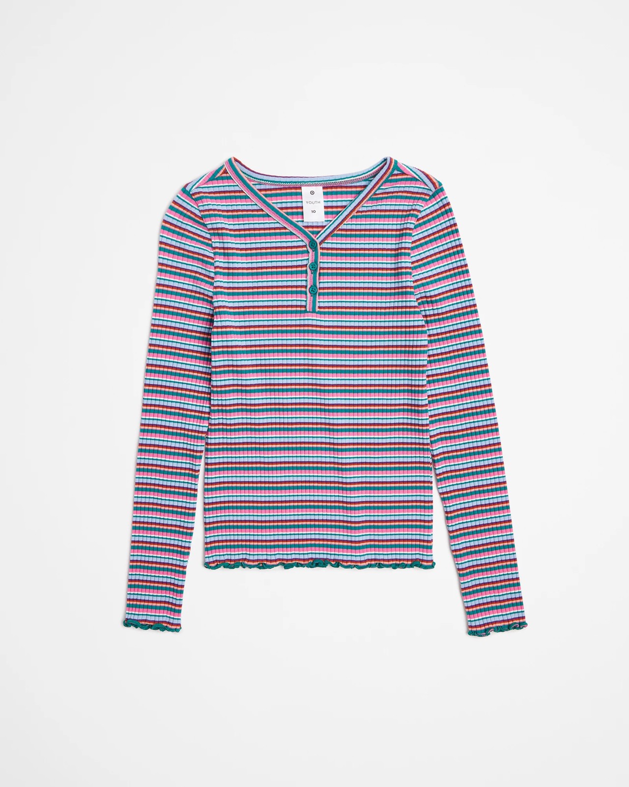 This Long Sleeve Henley Rib Top is a must-have addition to any girl's wardrobe. Made from a cotton-rich fabric with stretch, it offers incredible comfort and freedom of movement. The V-neck Henley collar adds a stylish touch, while the long sleeves with lettuce cuffs add a feminine and fashionable detail. The lettuce hemline provides a trendy and unique twist. Whether she's dressing up for a special occasion or just running errands, this top will keep her looking stylish and feeling comfortable. Upgrade her wardrobe today with this versatile and trendy Long Sleeve Henley Rib Top.