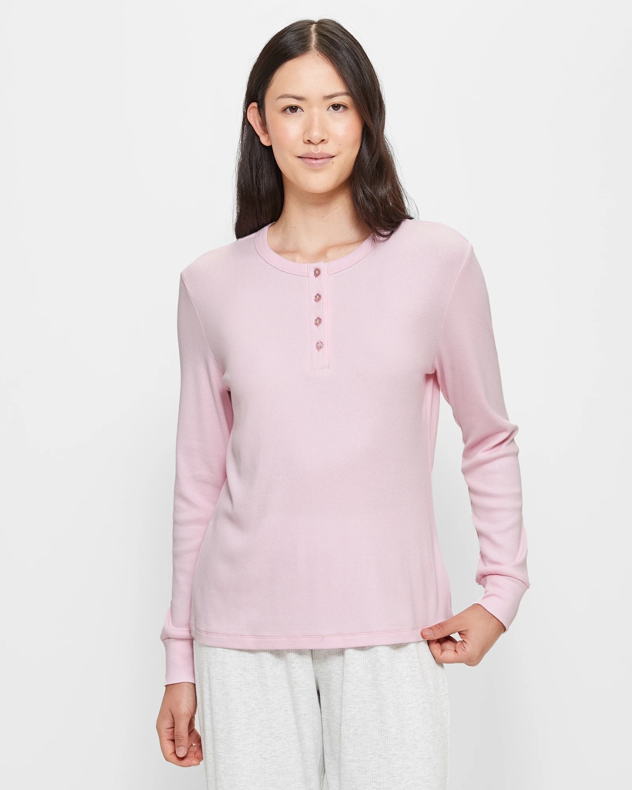 Indulge in comfortable and stylish sleepwear with our Long Sleeve Henley Sleep Top. This top is made from a soft cotton/viscose blend, providing a stretchy and cosy fit. With its regular fit and pink colour, it adds a touch of elegance to your bedtime routine. The all-over ribbed design adds texture and sophistication, while the classic henley design with a round neckline and button-down front adds a timeless appeal. The long cuffed sleeves keep you warm and the straight hemline ensures a neat look. Upgrade your sleepwear collection with this stylish and comfy top. Shop now for the ultimate sleep experience!