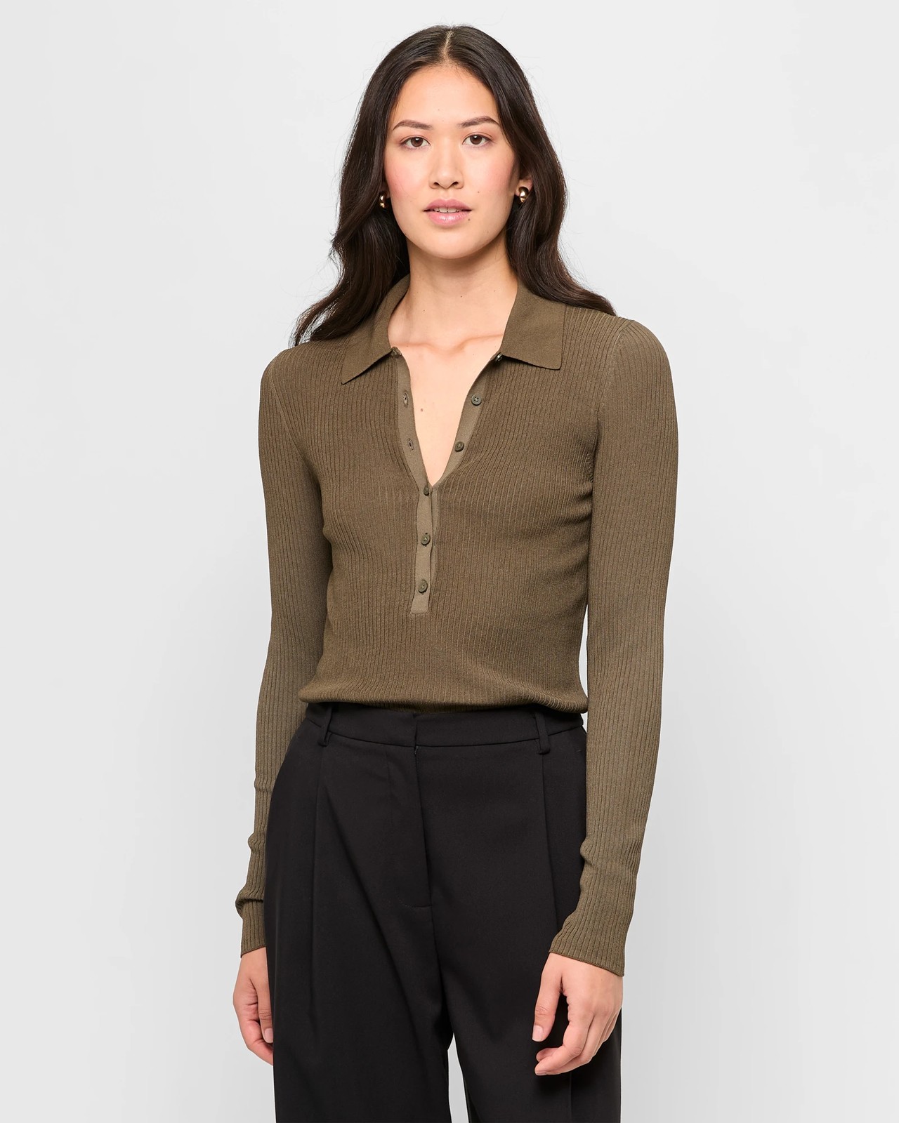 Discover our Long Sleeve Knit Polo Top from the Preview collection. This versatile piece is made from a blend of viscose and nylon, ensuring a comfortable and stretchy fit. The top features an all-over ribbed texture for added sophistication. With a button-down front and a round collared neckline, it brings a classic charm to your wardrobe. The long sleeves and straight hemline make it perfect for both casual and formal occasions. Elevate your style with this must-have item.