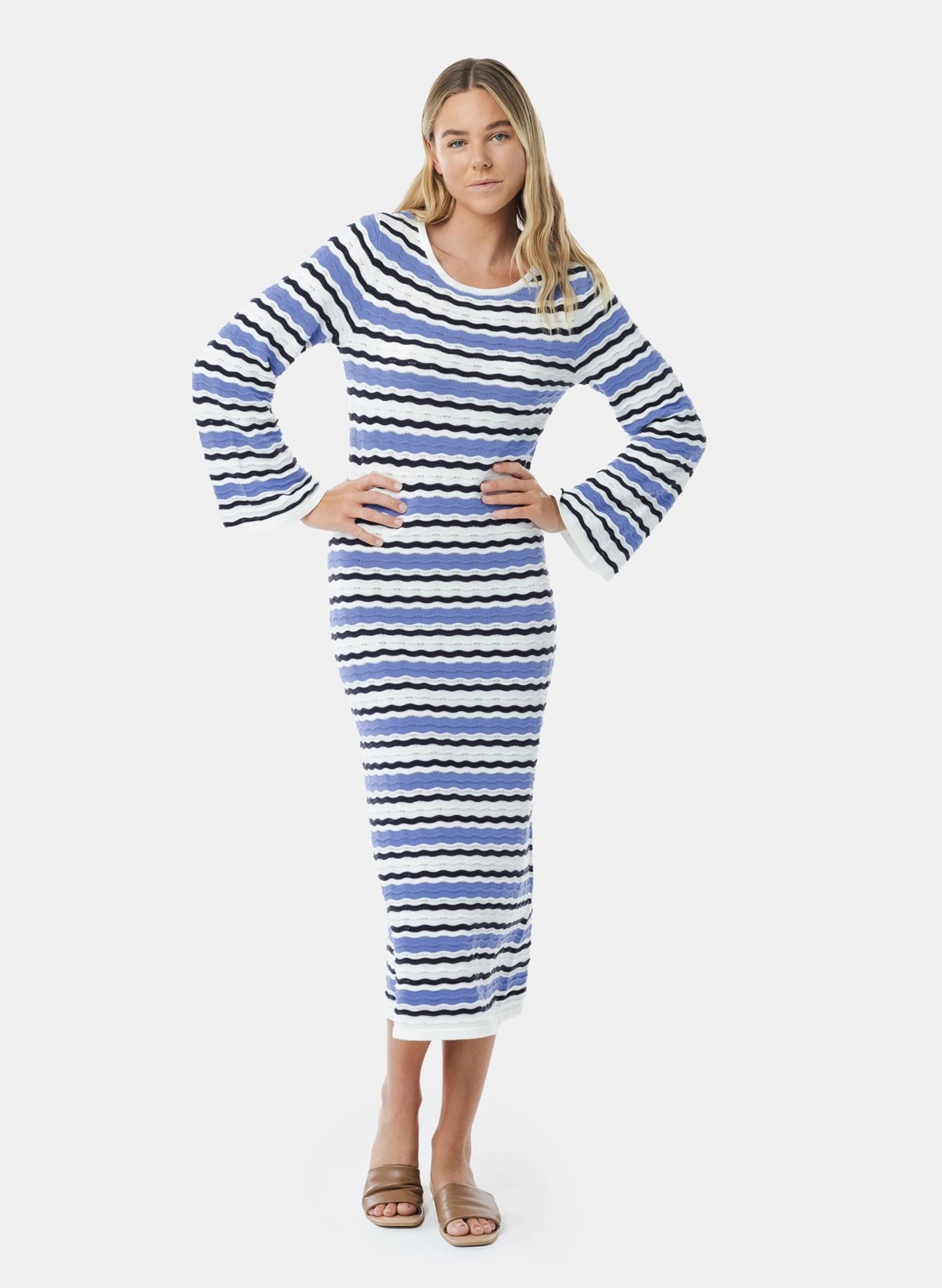 The Piping Hot Knit Dress is a fashionable and flattering style featuring a stylish knit stripe design. The dress is made from high quality cotton yarns and features bell sleeves, a fitted body and round neckline. Dress it up with heels or keep it casual with sandals!