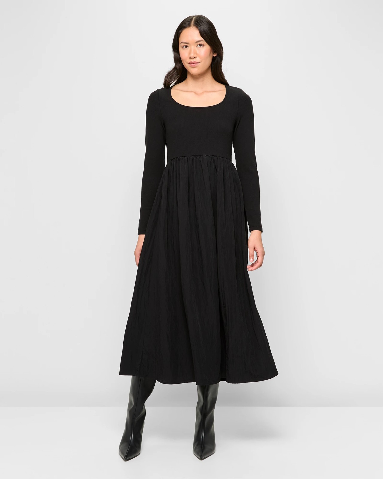 Step into sophistication with our Long Sleeve Knit Woven Midi Dress. Crafted for any setting, this dress features a ribbed bodice and a textured skirt, creating a delightful contrast. The scoop neckline and elastic waist offer a cosy fit that enhances your natural form. Whether for a day outing or a night event, this midi-length dress with a classic straight hemline is both versatile and stylish. Make it a key element in your wardrobe today.