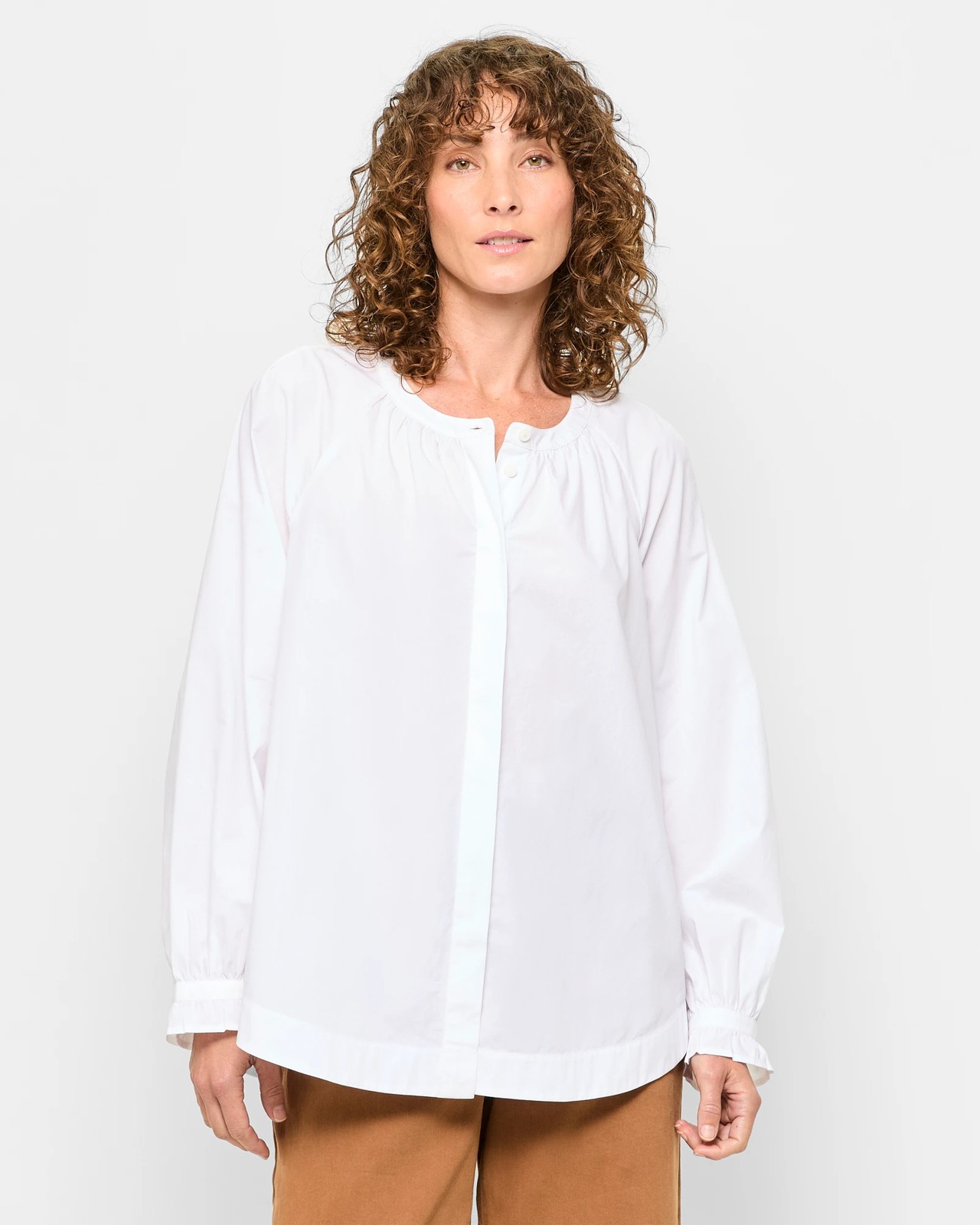 Transform your wardrobe with our Long Sleeve Poplin Blouse, a perfect choice for today's woman. Made from soft cotton, this blouse offers a light and breezy experience suitable for any occasion. It features a charming gathered round neck and long sleeves with fashionable button cuffs and a lower frill detail, combining style with practicality. The hidden button front adds a sophisticated touch, while its relaxed fit ensures day-long comfort. This white poplin blouse promises versatility and is a must-have addition to your collection. Make it yours and enjoy unparalleled comfort and style!